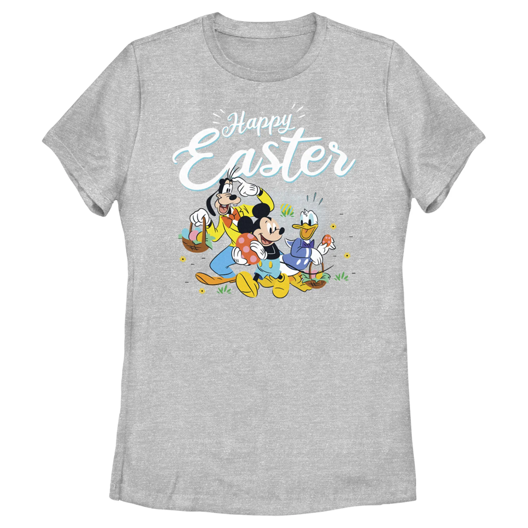 Grab a basket and go on a hunt for this Easter women's t-shirt! Featuring Goofy, Mickey Mouse, and Donald Duck holding baskets with text on top that says "Happy Easter."
