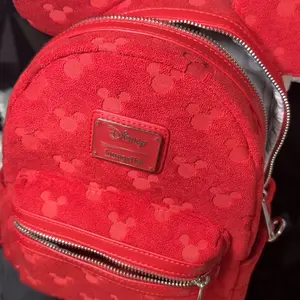 All Mickey all the time! This bag is ready to make a statement with you while keeping your essentials safe! This red mini backpack is made of faux leather and terry cloth. Mickey head silhouettes are "burned out" in the material to create an all-over pattern on the bag. This is a great accessory for any Disney fan that wants a little more Disney magic in their life. Features Terry cloth mini backpack with faux leather (polyurethane) trim Adjustable shoulder straps Front zipped pocket Side drop pockets 3D ears Mickey Mouse-shaped coin bag Applique, burnout terry cloth, and printed details Coordinating interior lining Dimensions: 9"W x 10.5"H x 4.5"D