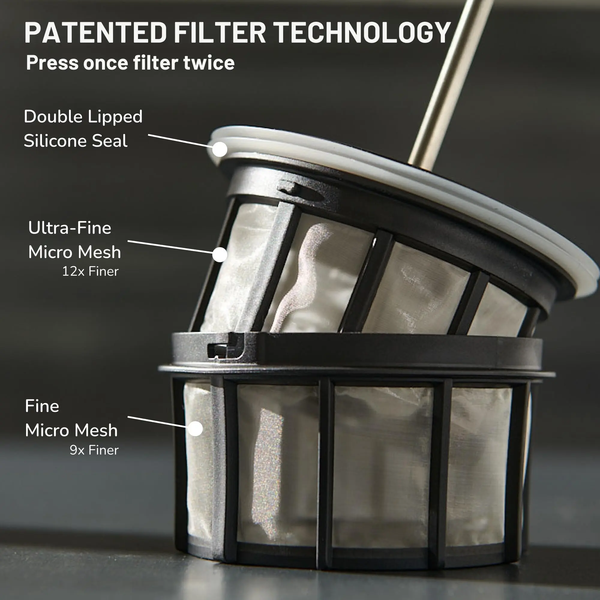 ·GRIT & SLUDGE FREE COFFEE: Experience unparalleled purity with our patented double micro-filter, ensuring each cup is free of grit and sludge. Unlike other presses, our design leaves no sip behind, delivering smooth, clean coffee every time.