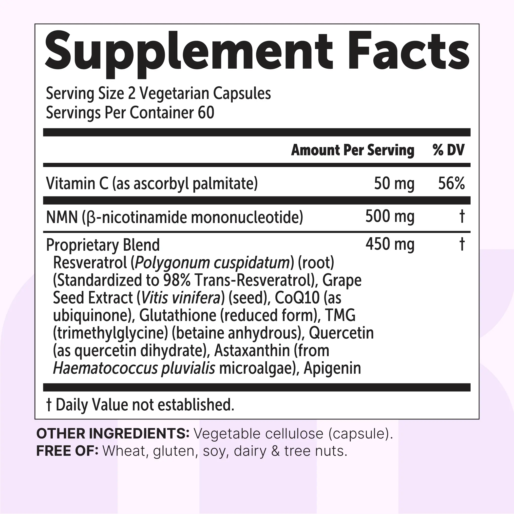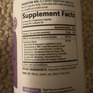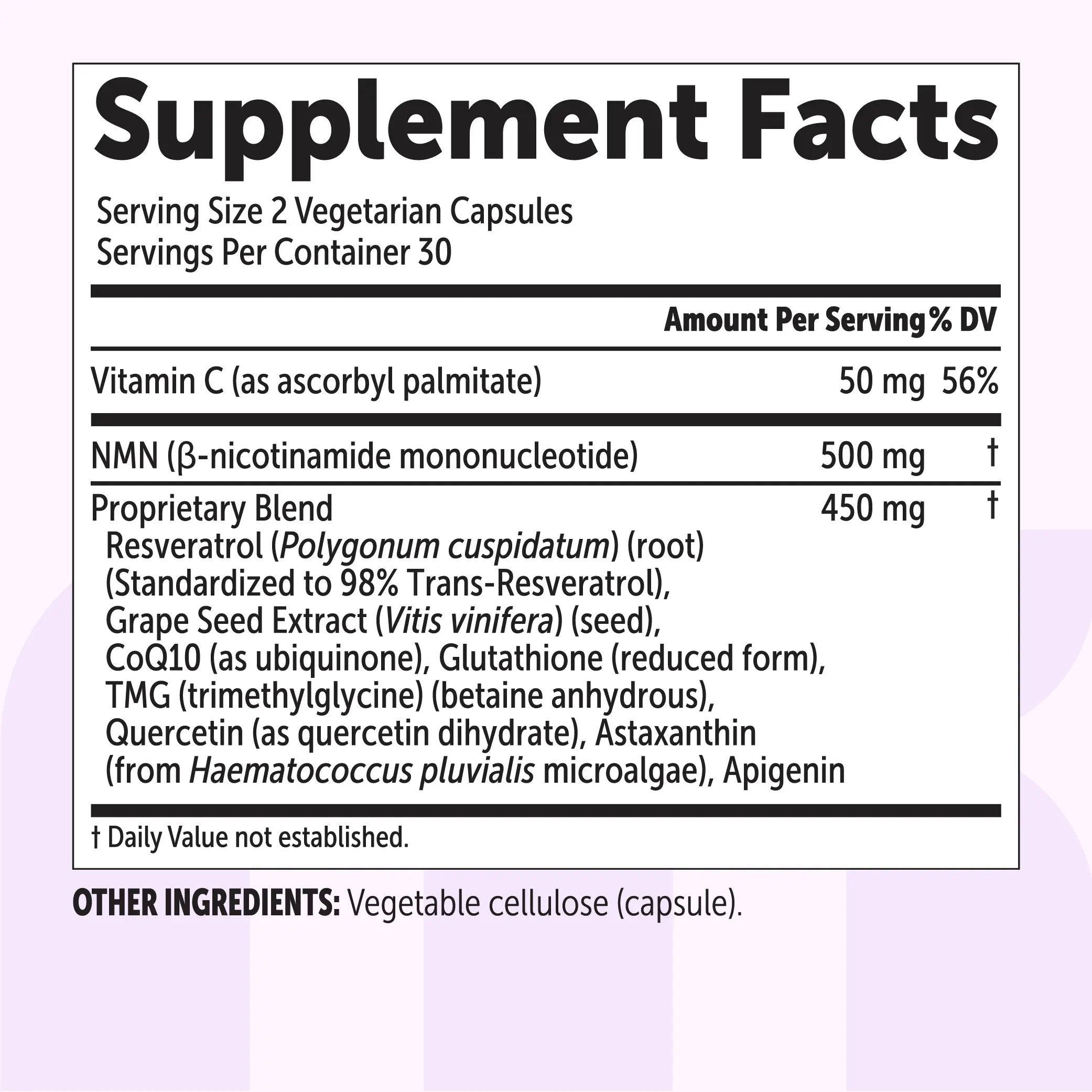 ·This formula combines resveratrol standardized to 98% trans-resveratrol with apigenin, fat-soluble vitamin C, CoQ10, grape seed extract, glutathione, TMG, astaxanthin, and quercetin, brought together in one supplement to complement NMN.