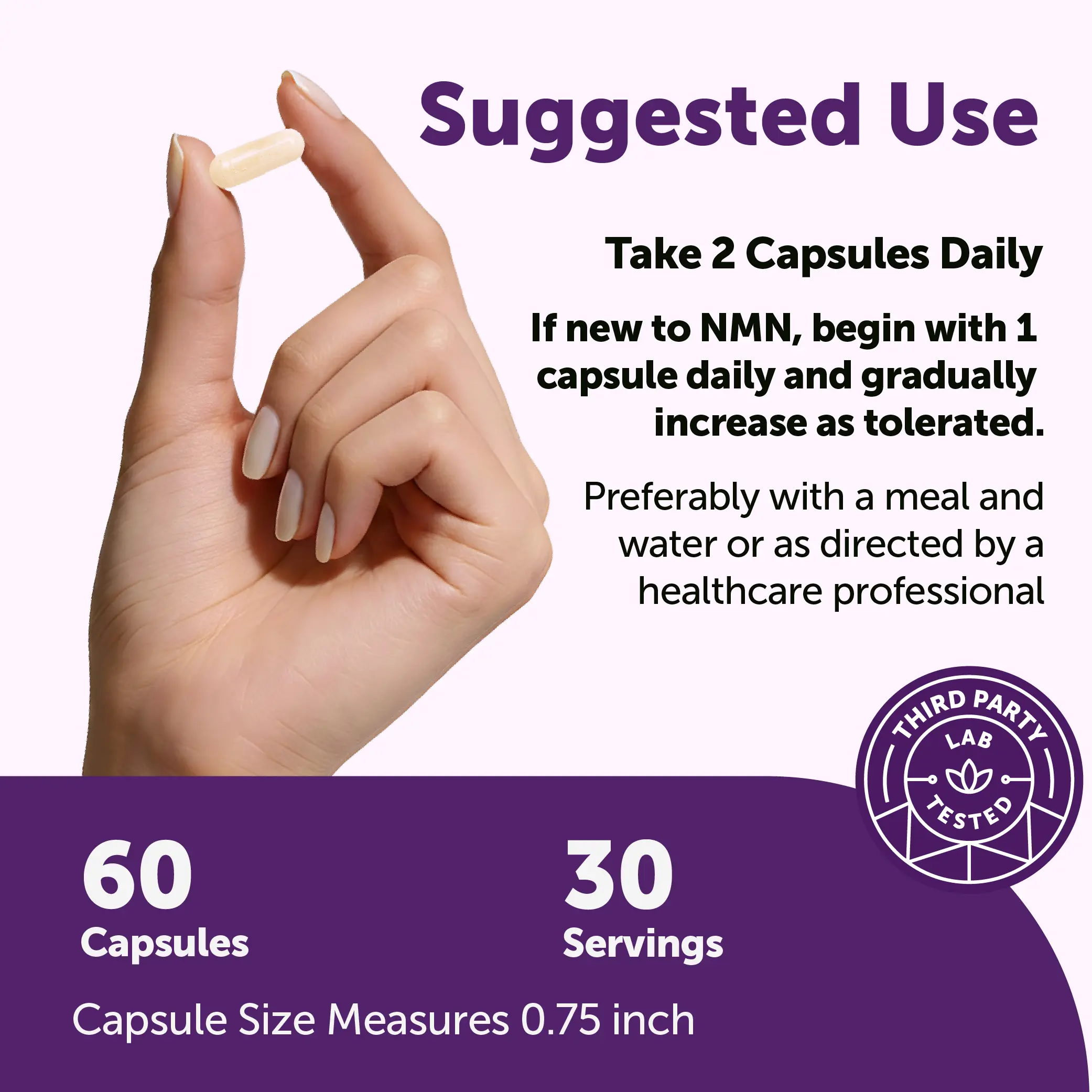 ·Each bottle contains natural vegetarian capsules, delivering 500mg of β-nicotinamide mononucleotide (NMN) plus an 8-ingredient 450mg proprietary blend and 50mg of fat-soluble vitamin C.