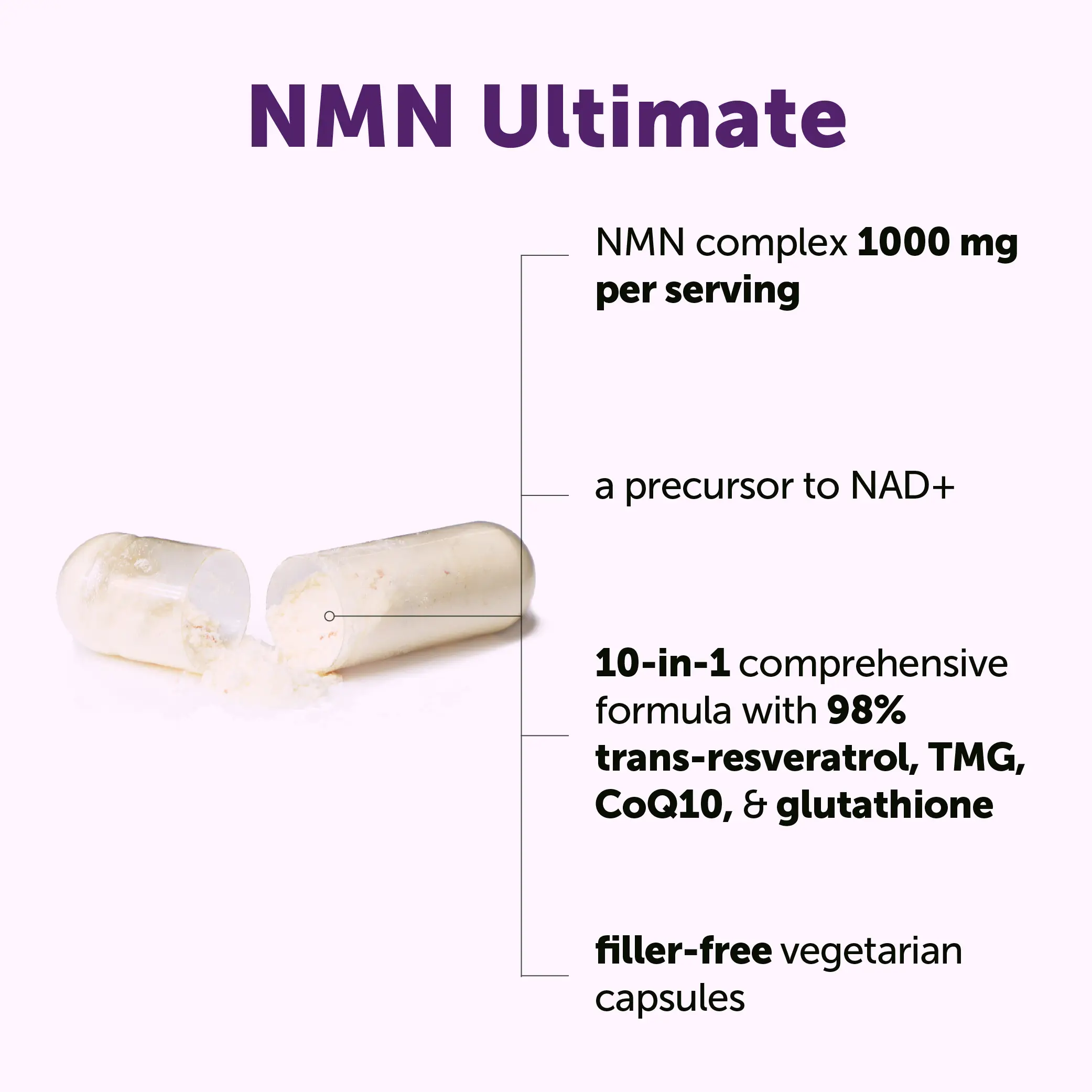·A vegan-friendly option for men and women that highlights a nutrient profile focused on NMN with plant-based extracts, coenzymes, and carotenoids as an ultimate NAD+ supplement precursor.