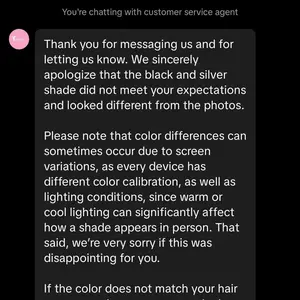 Me en mataron muy buen cabello de muy buena calidad el largo exacto como lo pedí y el tono del color un poco más claro pero lo amé