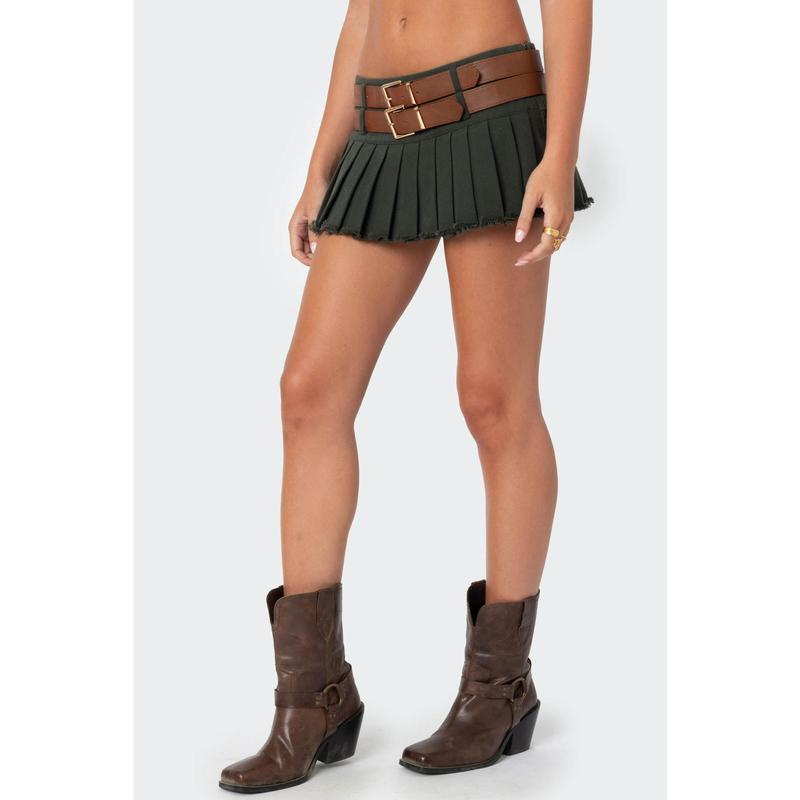 Double Belt Pleated Denim Micro Skort