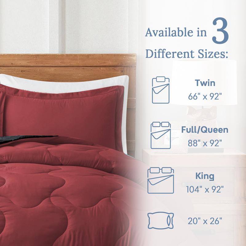 Transform your bedroom with this reversible comforter set! It comes in Twin, Full/Queen, and King sizes. Twin measures 66" x 92" with a 20" x 26" pillowcase. Full/Queen is 88" x 92" with 2 pillowcases. King is 104" x 92" with 2 pillowcases. All sizes feature wavy stitched edges and corner ties. Choose from various colors to match your decor.