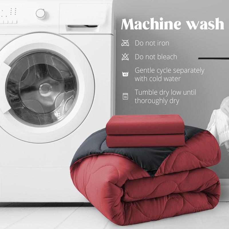 Machine wash this comforter set gently in cold water on a separate cycle. Avoid ironing, bleaching, and tumble drying on high heat. Follow these steps to keep your set looking new. The comforter's reversible design allows you to switch between two looks effortlessly. Enjoy a stylish and comfortable night's sleep.