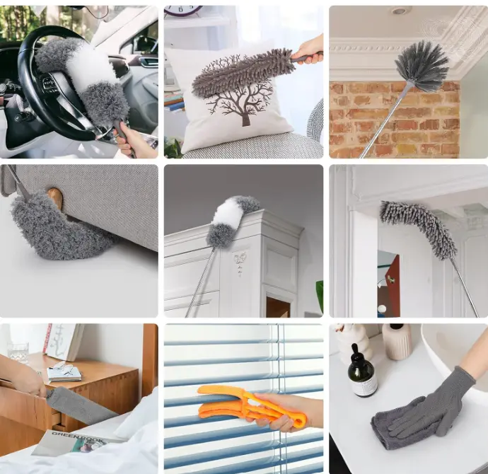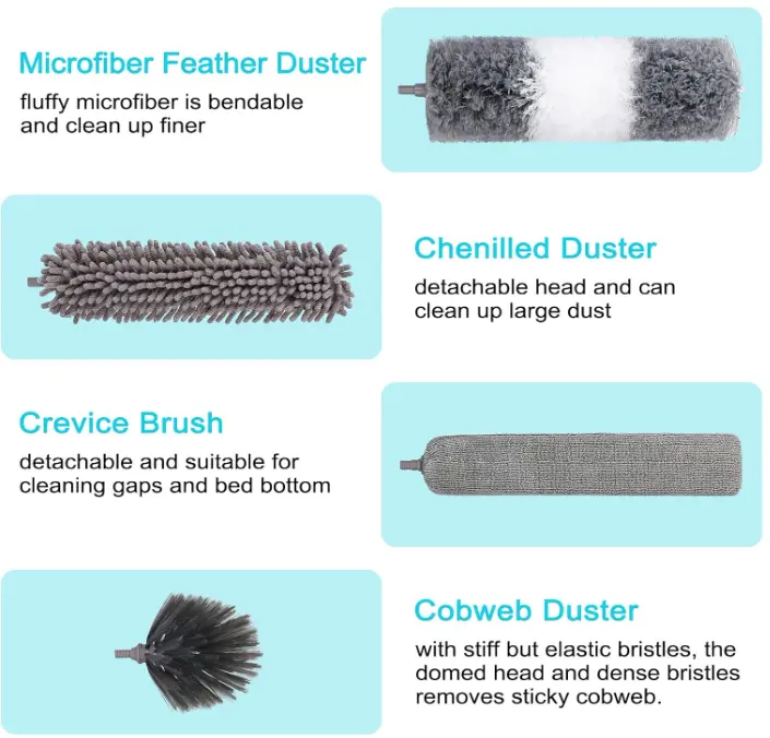 12 PCS Feather Duster Kit: This microfiber hand duster set includes 2m Telescopic Pole, 1 Bendable Microfiber Duster Head, 2 Chenille Duster Head, 1 Cobweb Duster Head and 2 Crevice Brush, 1 blinds duster, 1 Microfiber Cleaning Cloth and 2 5in short handle, A pair of grey gloves. Replacing different types of duster brush heads can handle different cleaning scenarios, keeping your home away from dust.