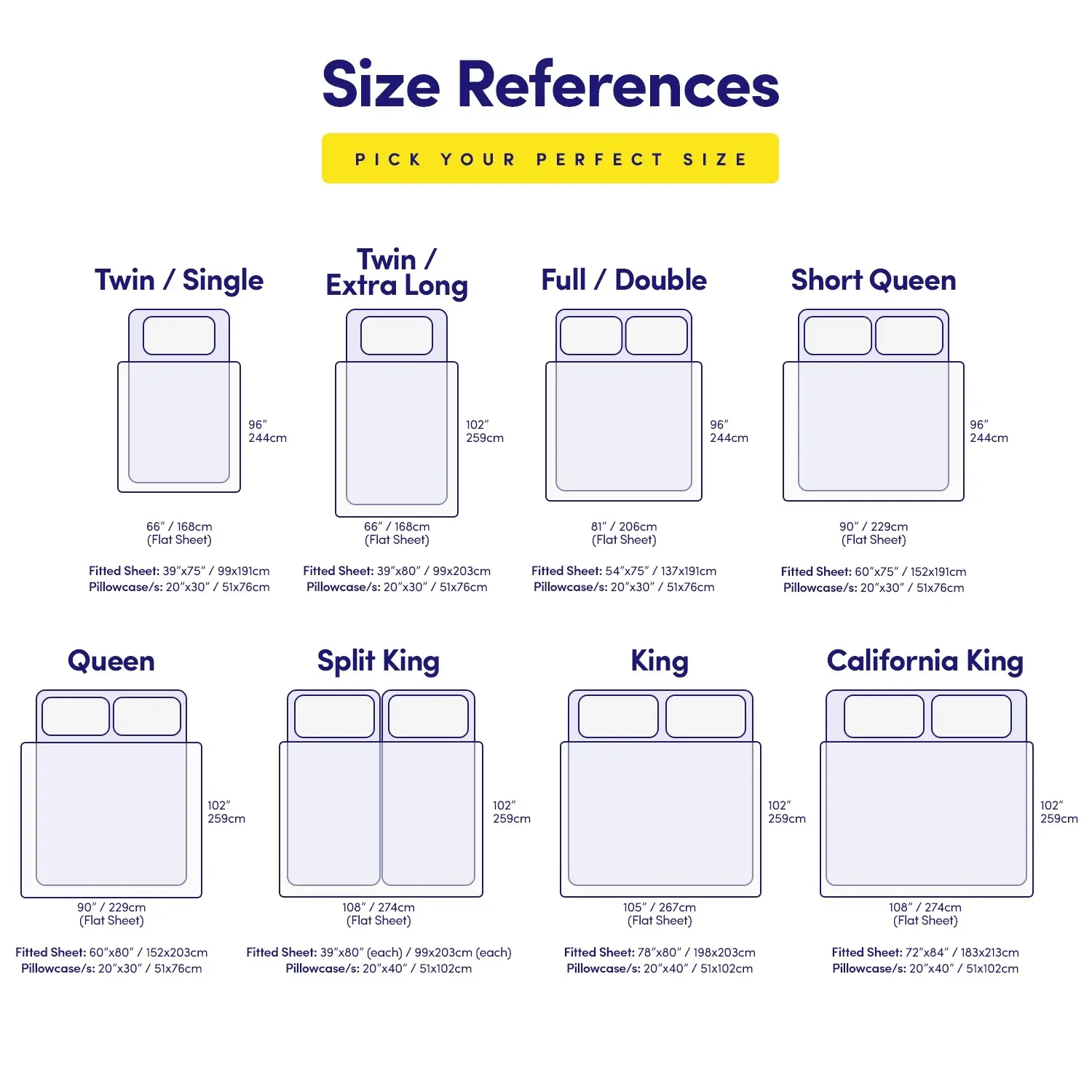Β·California King Size: 1-Flat Sheet: 102" L x 108" W, 1-Fitted Sheet: 72" L x 84" W, 4-Pillow Case: 20" L x 40" W each