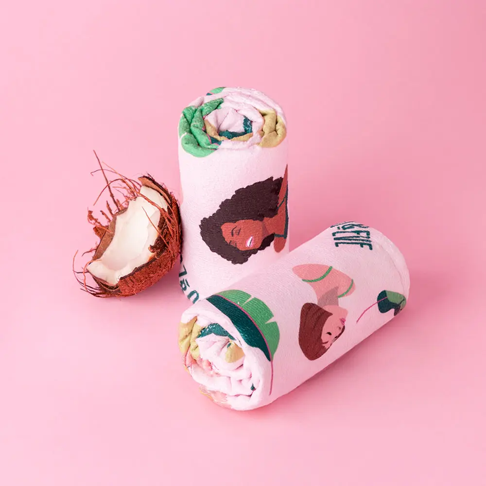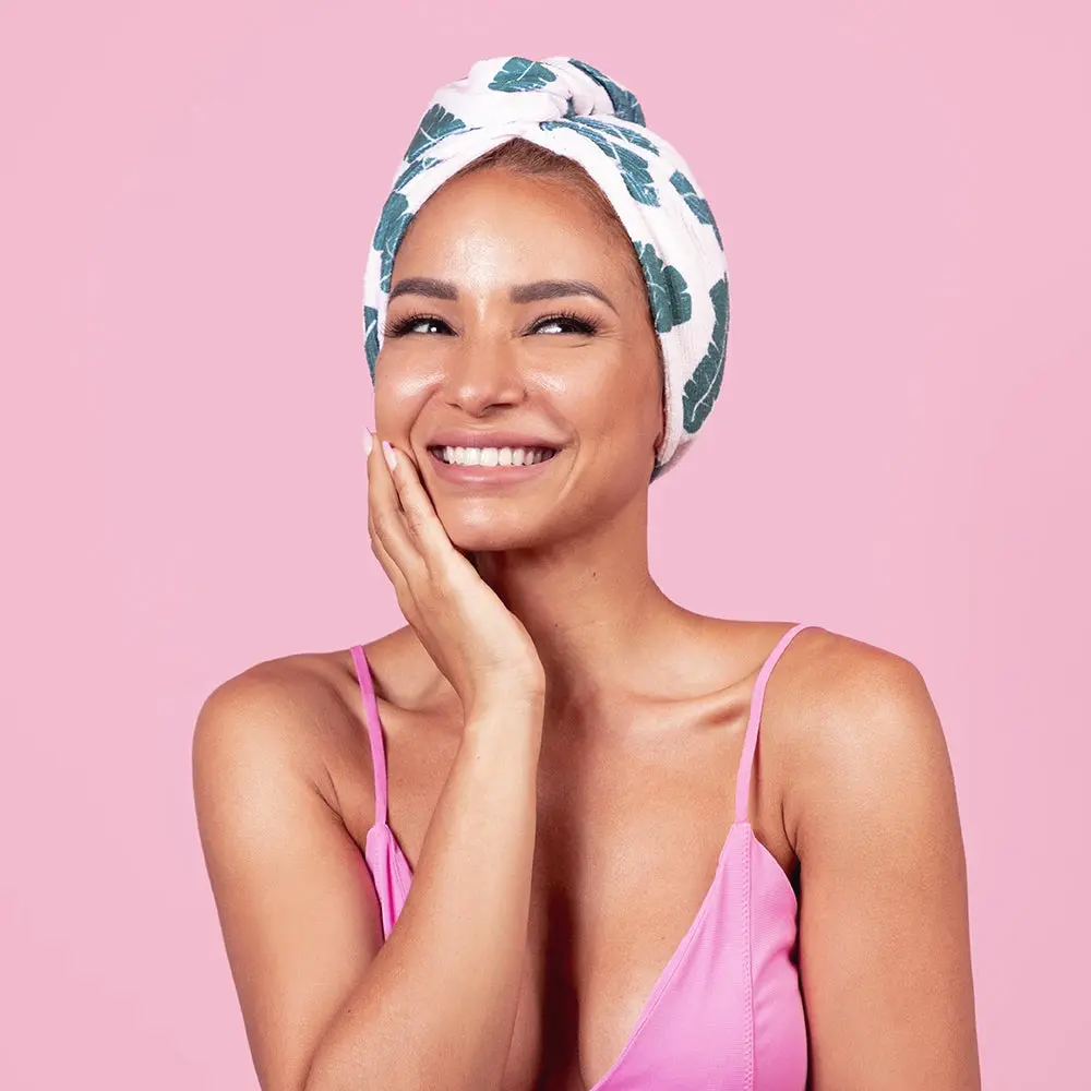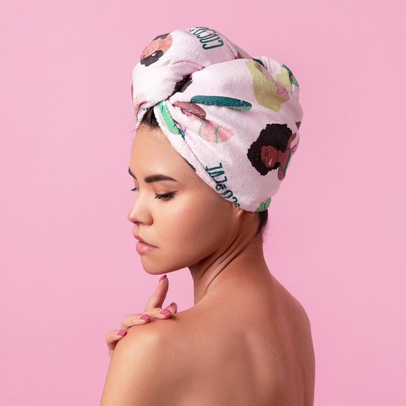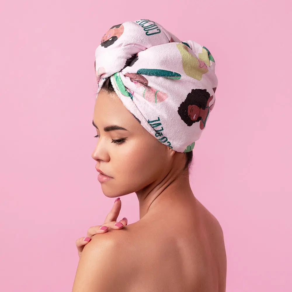 Combat frizz and split ends with our ultra soft absorbent microfiber wrap that cuts dry time and pairs perfectly with your hair mask. Available in: Leaf Print, Girl Print, and Pool Print
