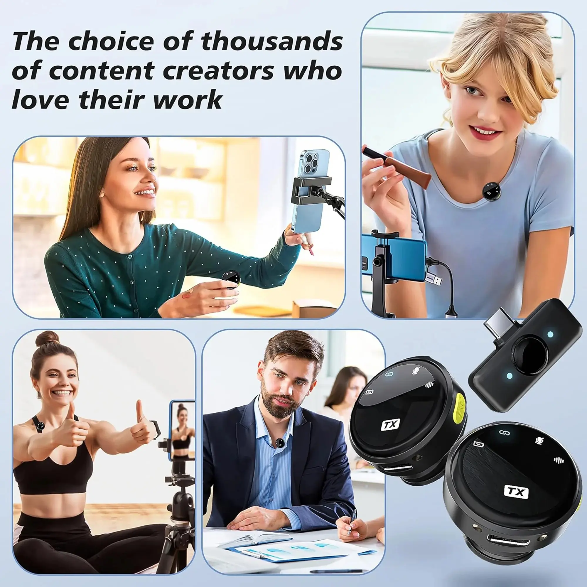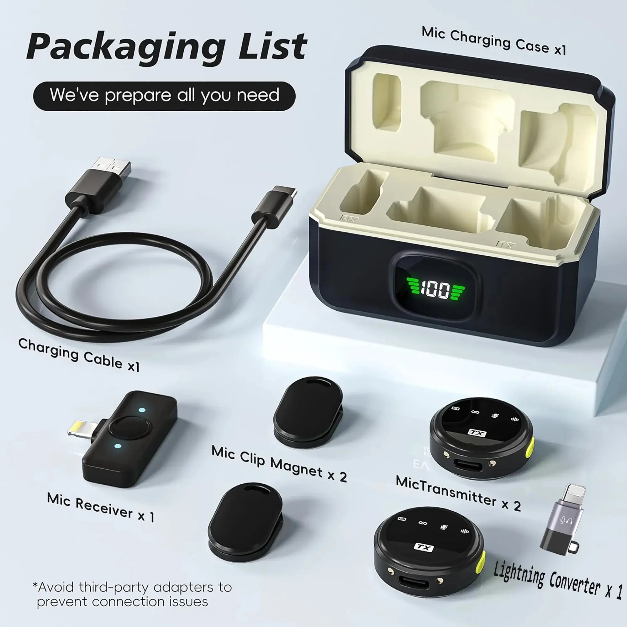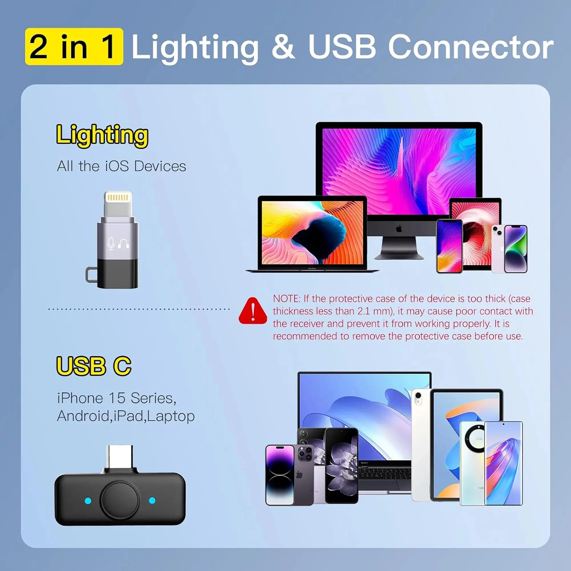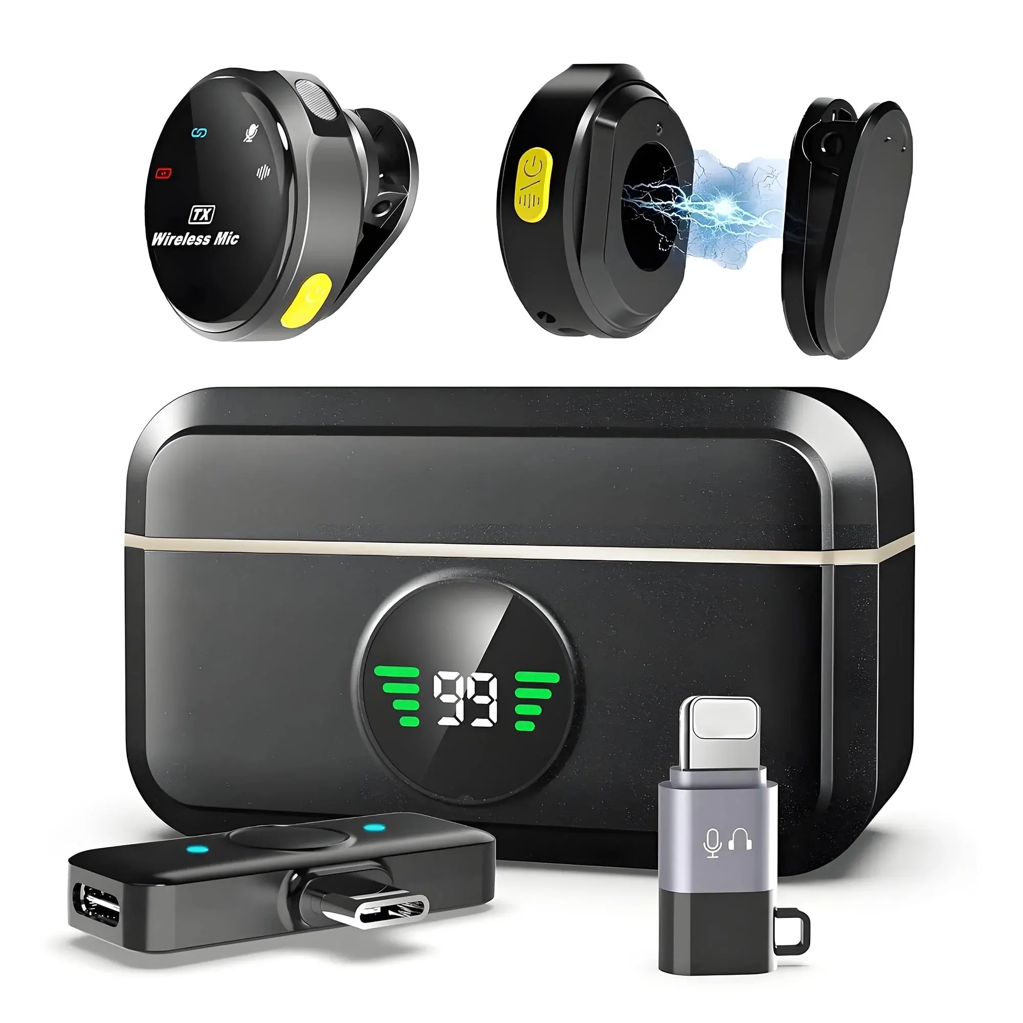 Q8 wireless lavalier microphone offers plug-and-play convenience (no APP, Bluetooth, or cables, auto - pairing). It has 2 in 1 Lightning & USB - C connectors for iOS, iPhone 15, Android, iPad, and laptops (remove thick cases). With a charging case,it provides 12hrs dual mic runtime up to 40hrs (1hr charge). Wear it via magnetic suction or clip-on. Boasting a smart noise-reduction chip (-20dB, one-touch control) and a 65ft wireless range, it delivers crisp sound for vlogging, streaming, etc.