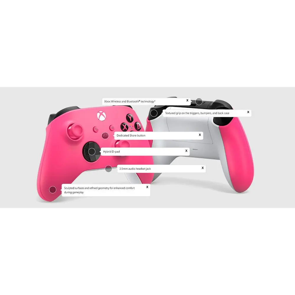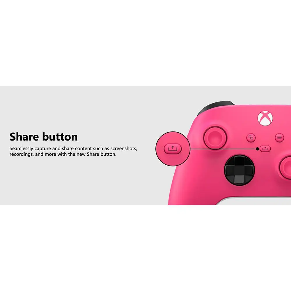 The Xbox Wireless Controller in Deep Pink delivers exceptional comfort, control, and compatibility. Designed with sculpted surfaces and refined geometry, it features textured grips on the triggers, bumpers, and back case for a secure feel. The hybrid D-pad offers precise, responsive input, while the dedicated Share button lets you capture and share moments instantly. Compatible with Xbox Series X|S, Xbox One, Windows PCs, Android, and iOS, it connects via Xbox Wireless and Bluetooth for seamless multi-platform gaming. With up to 40 hours of battery life, it's built for long play sessions.