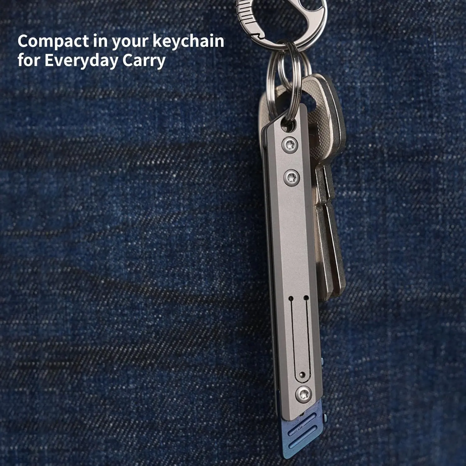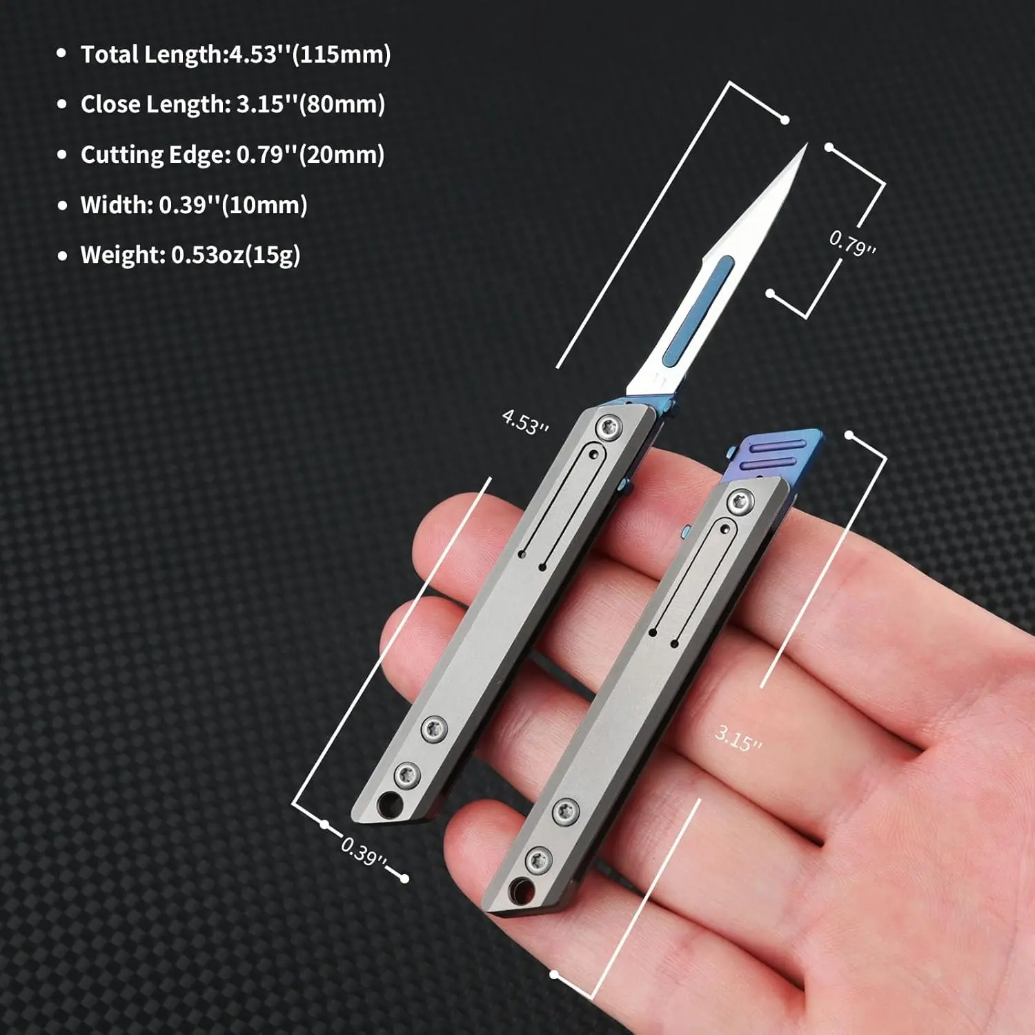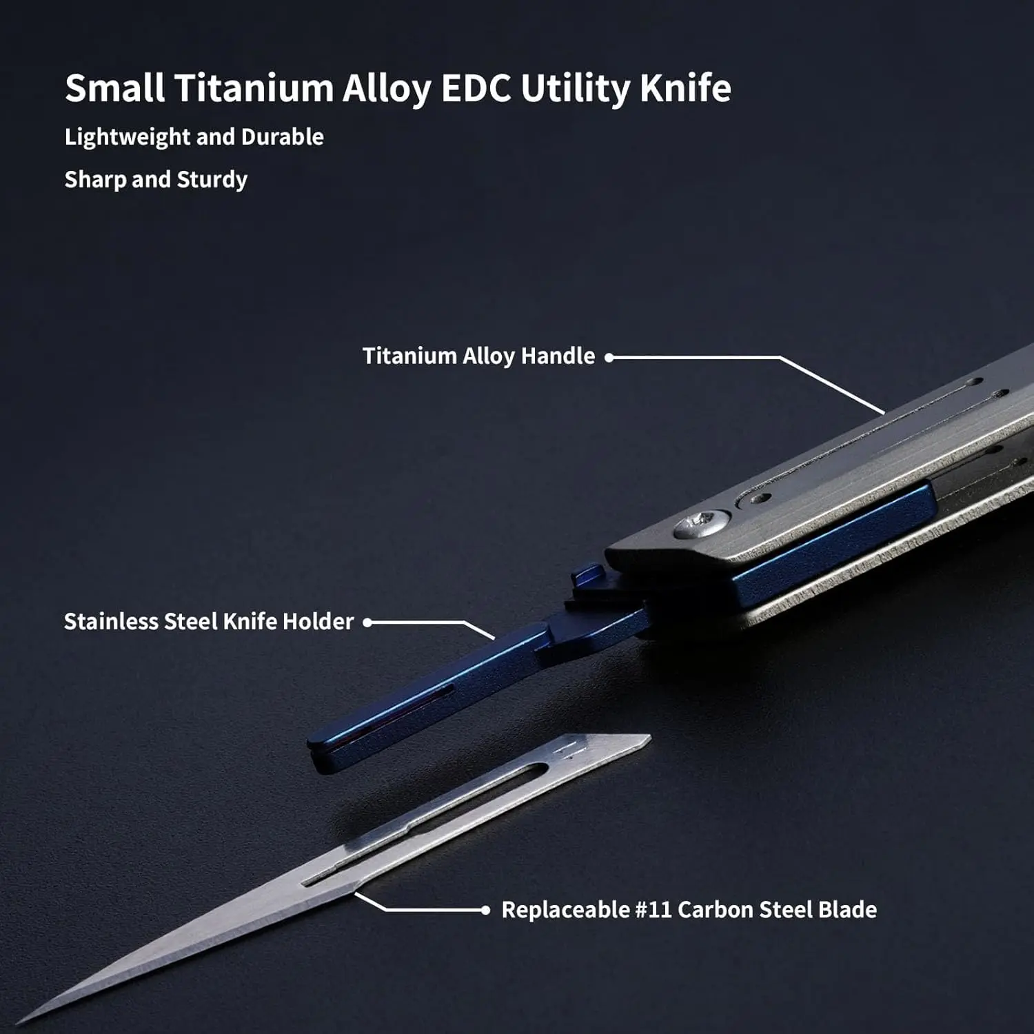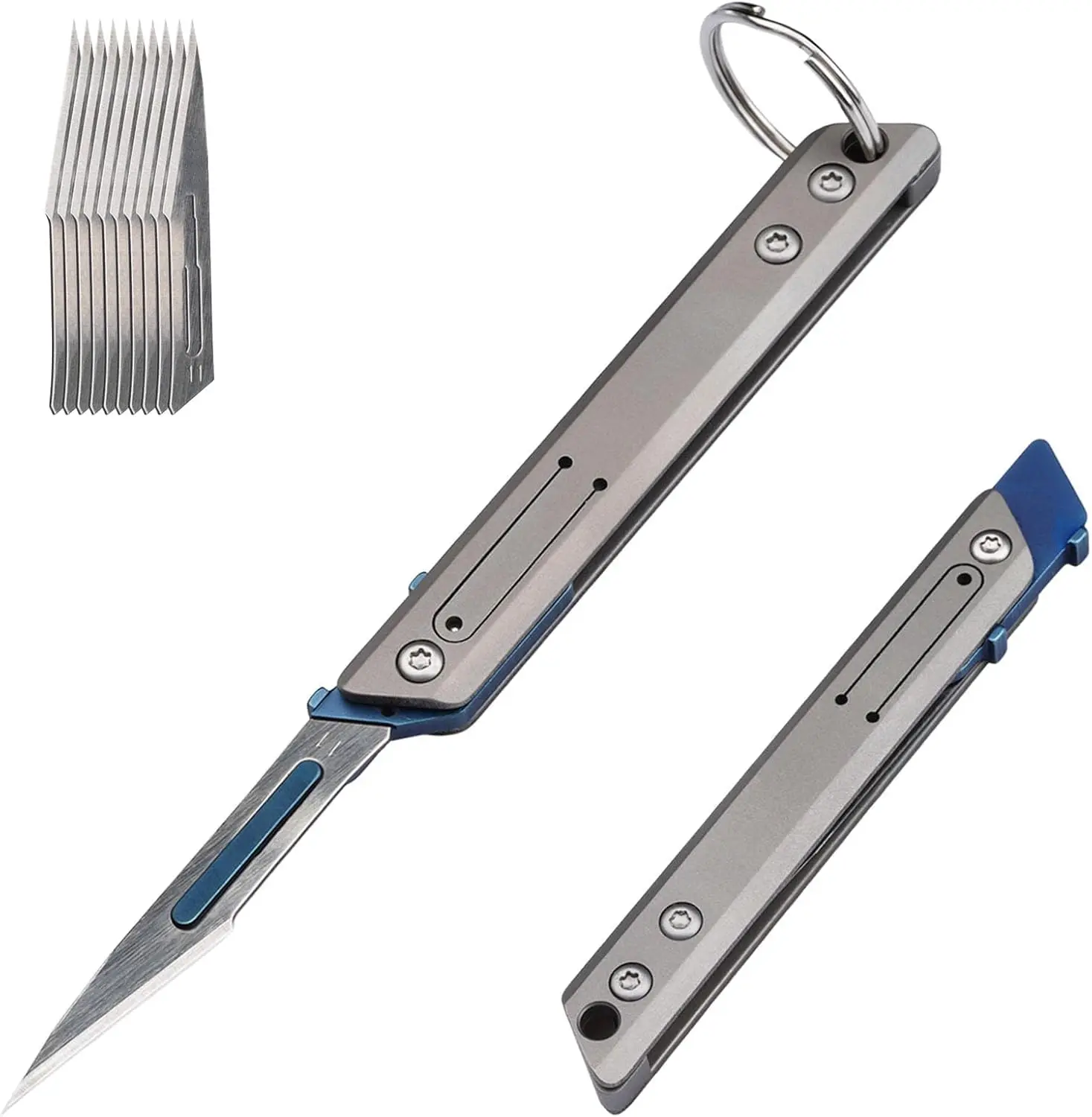 🔧 The handle of the EDC pocket knife is made of high-quality titanium alloy with a grey finish. It ensures lightweight construction and durability. The blade holder is made of stainless steel and accented in blue for a sleek look. This design allows for easy blade changes with the recommendation of using pliers for safety.