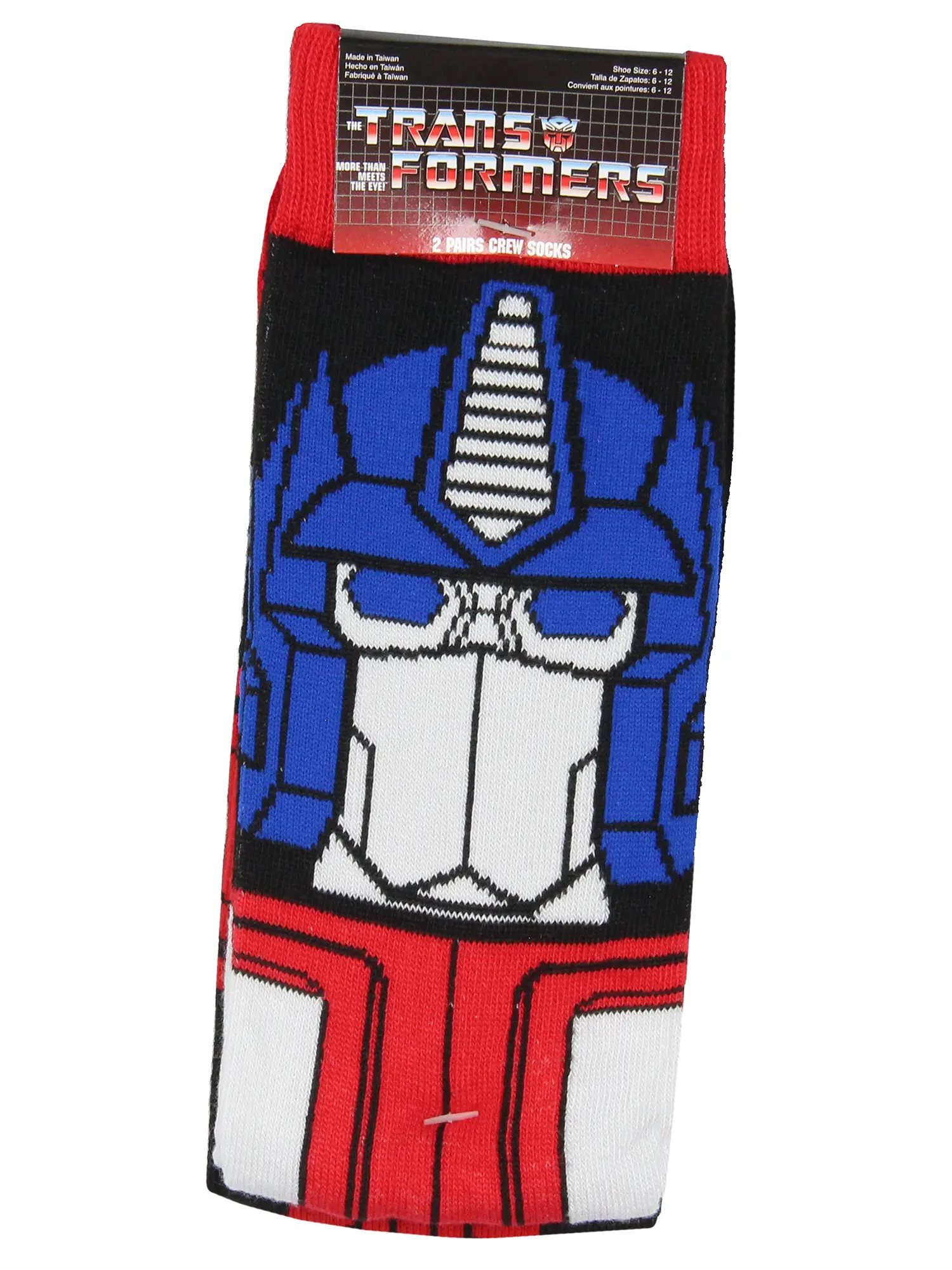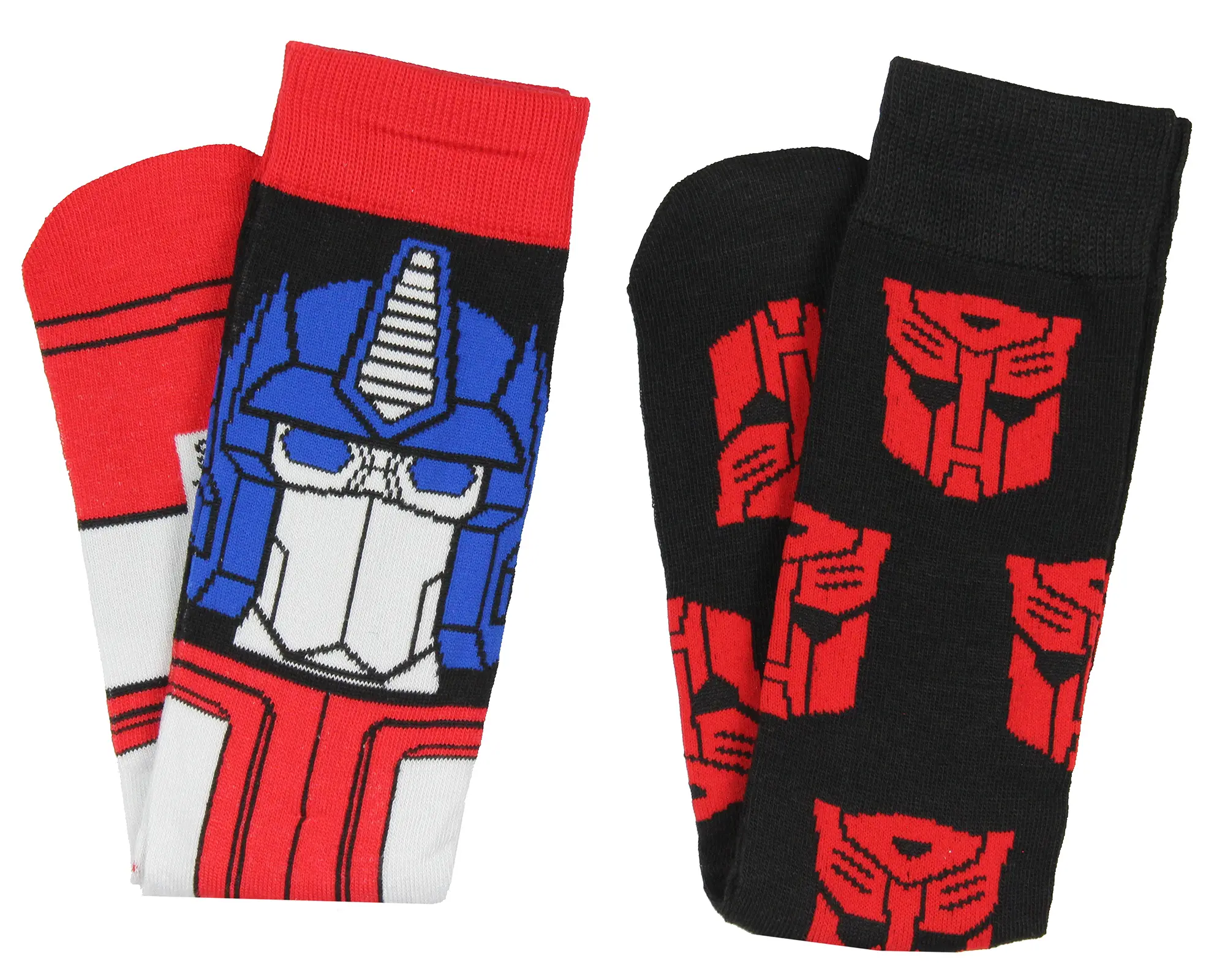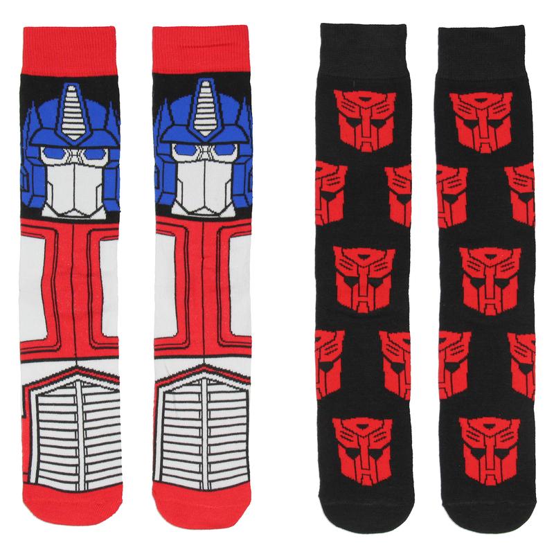 Elevate your sock game with these Transformers crew socks, great for any fan of the robots in disguise. One pair showcases an allover design of the bold and recognizable Autobot logo, letting you proudly display your allegiance. The second pair features a dynamic Optimus Prime design, vividly capturing the heroic leader's powerful presence. Crafted for comfort and durability, these socks are made from a soft, stretchy material that provides a snug fit, making them ideal for everyday wear or adding a touch of fandom to any outfit. Whether you're gearing up for battle or just a day at the office, these socks ensure you step out in style. Fits shoe sizes 6-12. Made of 70% polyester, 20% nylon, and 10% spandex. GREAT Product Sizing: These socks are designed to fit most sizes comfortably, ensuring a snug yet flexible fit. Whether wearing them for a casual day out or just lounging at home, these socks provide the great combination of comfort and character flair. These socks fit Shoe Sizes: 6-12 Durable Quality: Crafted with premium materials, these mid-calf crew socks are built to last. The reinforced heel and toe areas offer added durability, making them a long-lasting addition to your wardrobe. The fabric blend ensures softness and breathability, keeping your feet comfortable all day long. Made of 70% polyester, 20% nylon, and 10% spandex Versatile Sock Drawer Addition: These socks are versatile enough for various outfits with their distinctive designs and comfortable fit. Whether you're pairing them with sneakers for a casual look or wearing them with boots, these socks add a touch of Transformers magic to any ensemble Great for All Fans: Whether you're a lifelong Transformers fan or new to the series, these socks make a fantastic gift for any occasion. great for birthdays, holidays, or just because, this 2-pack will surely delight fans of all ages. Add some action-packed style to your sock collection with these must-have Transformers mid-calf crew socks