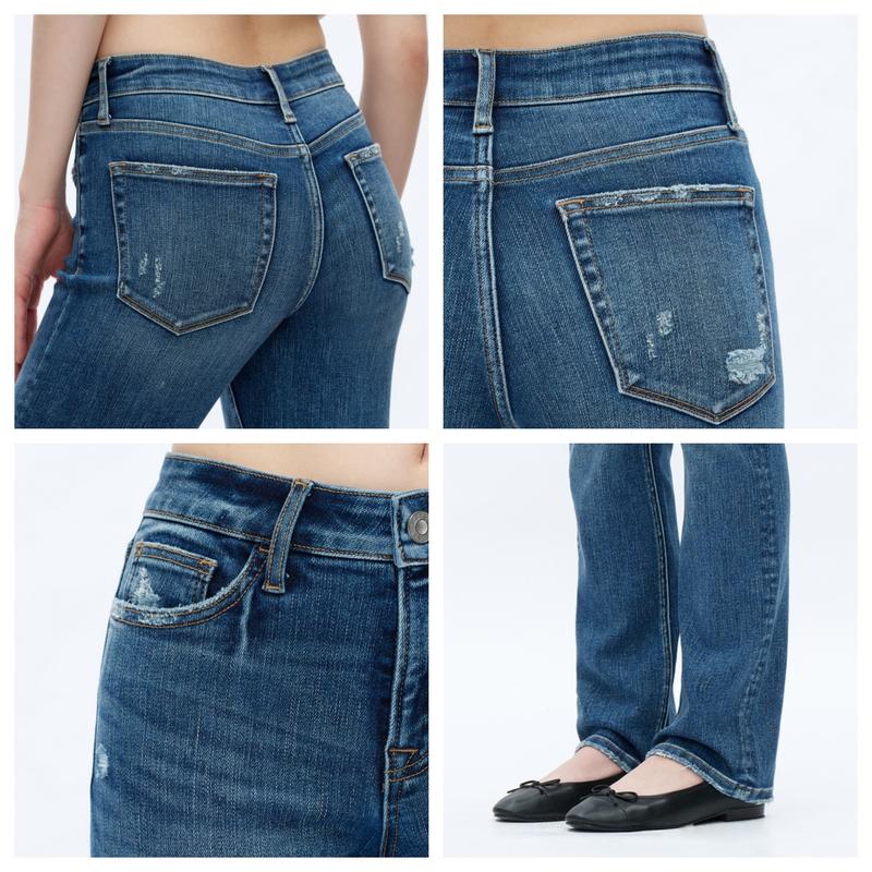 Vogatiques Mid Waist Straight Leg Jeans Distressed Stretchy Denim Pants New Jeans Minimalist Tummy Control Regular Size Plus Size