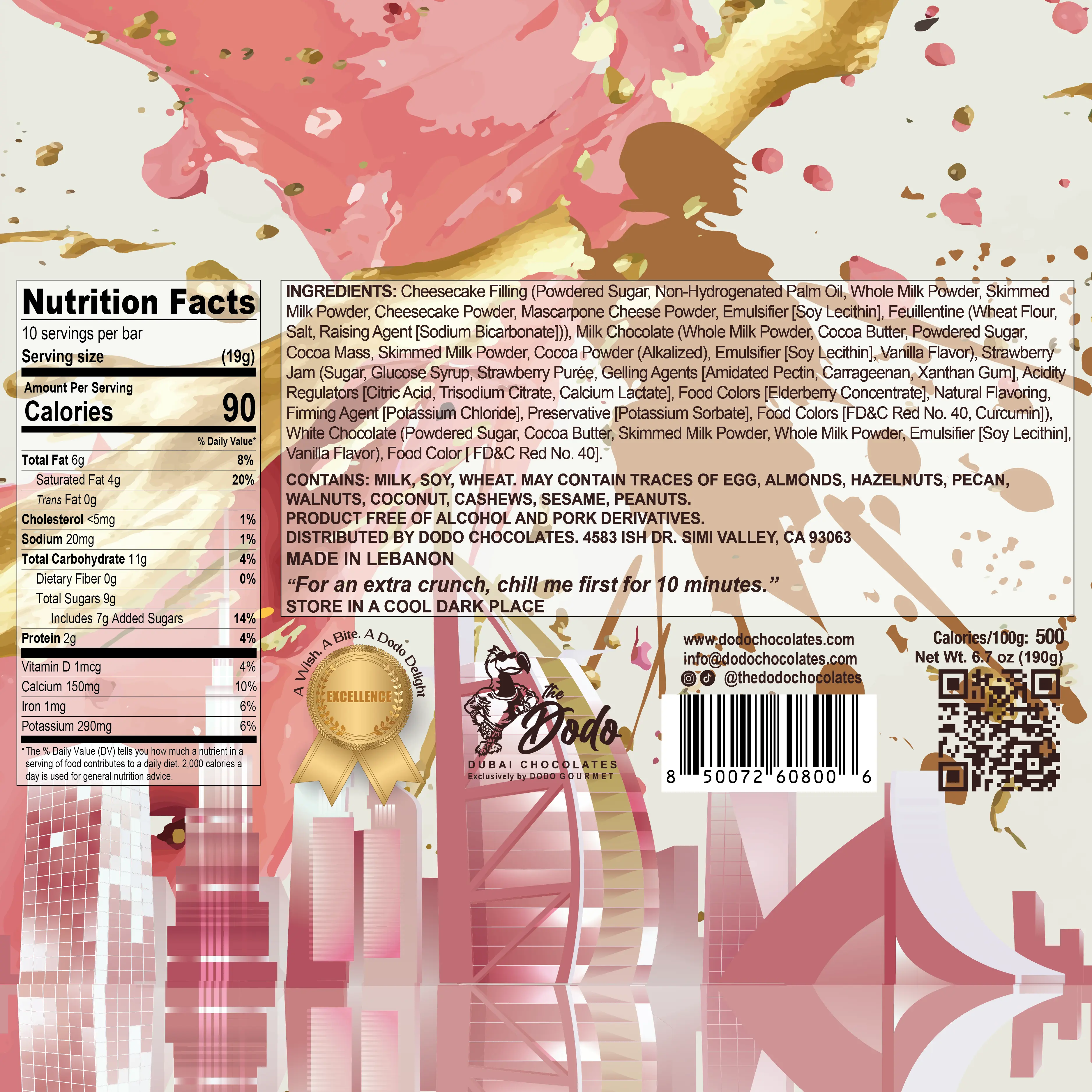 Indulge in a dreamy fusion of creamy cheesecake, juicy strawberry notes, and smooth milk chocolate. This viral sensation captures the charm of a strawberry cheesecake in a single, irresistible bar.