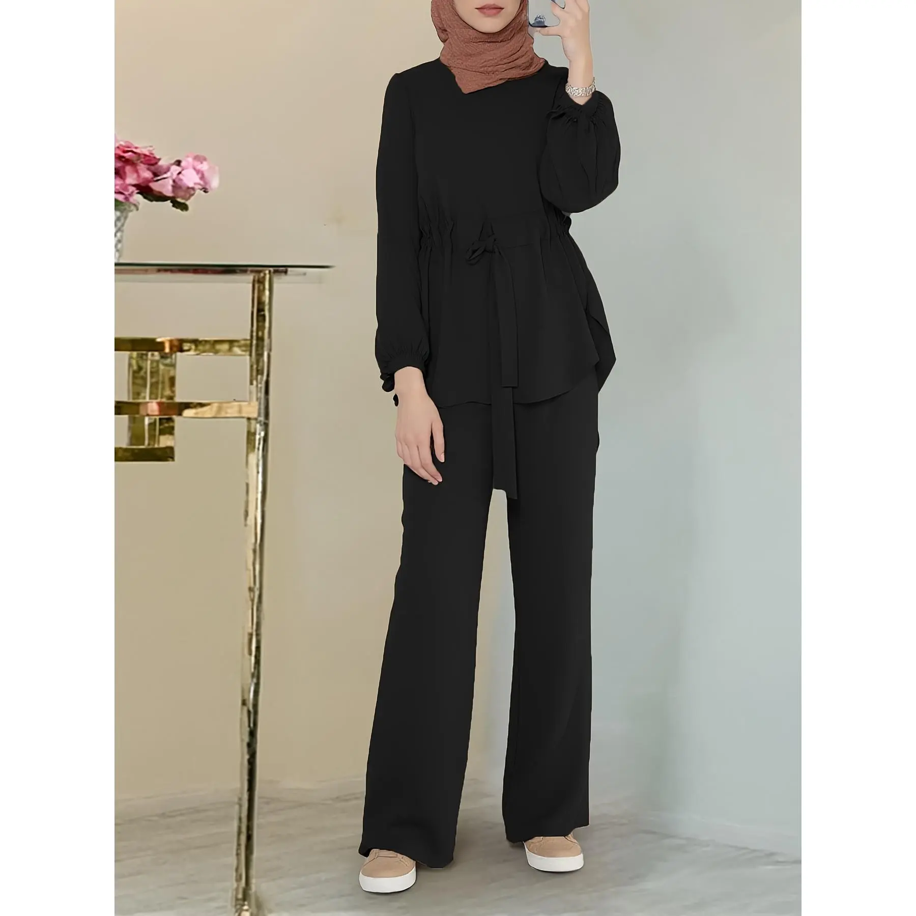 Middle Eastern Muslim Two-Piece Set: Solid Color Drawstring Tie-Up Top and Wide-Leg Pants for Women, Elegant Arabian Outfit with Round Neckline, Modest Fashion, Casual Wear, Stylish Ensemble, Elegant Design, Breathable Material, Lightweight Fabric, Muslim