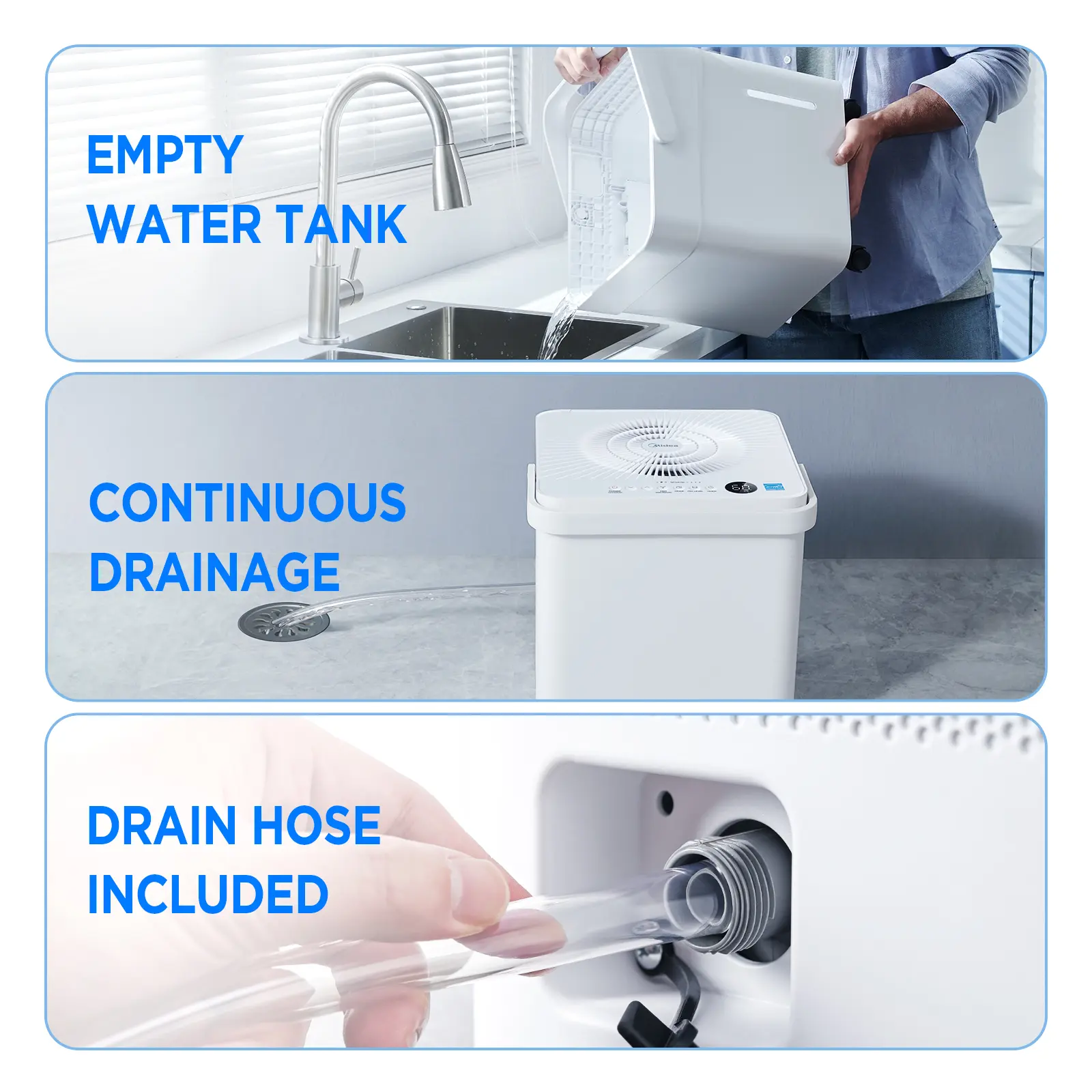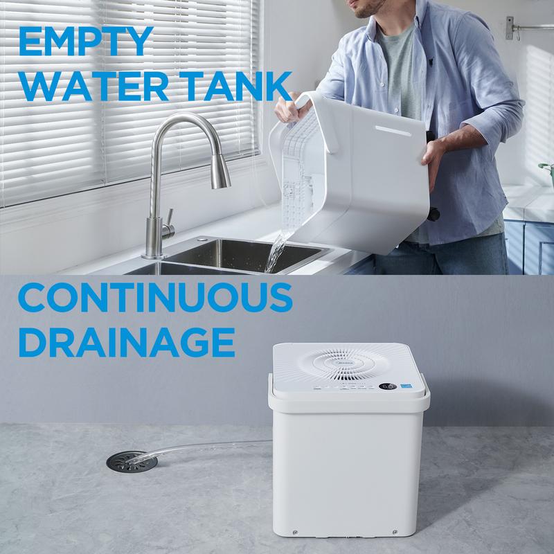 ·CONTINUOUS DRAIN OPTION - Versatile, no-bucket option provides more flexibility to remove moisture. You can remove the water tank and place the unit above the sink using the included drain hose, or position it over a floor drain, near a window or door