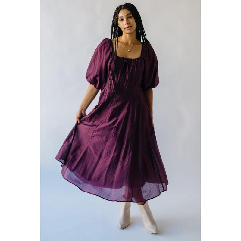The Gustafson Bubble Sleeve Midi Dress in Plum
