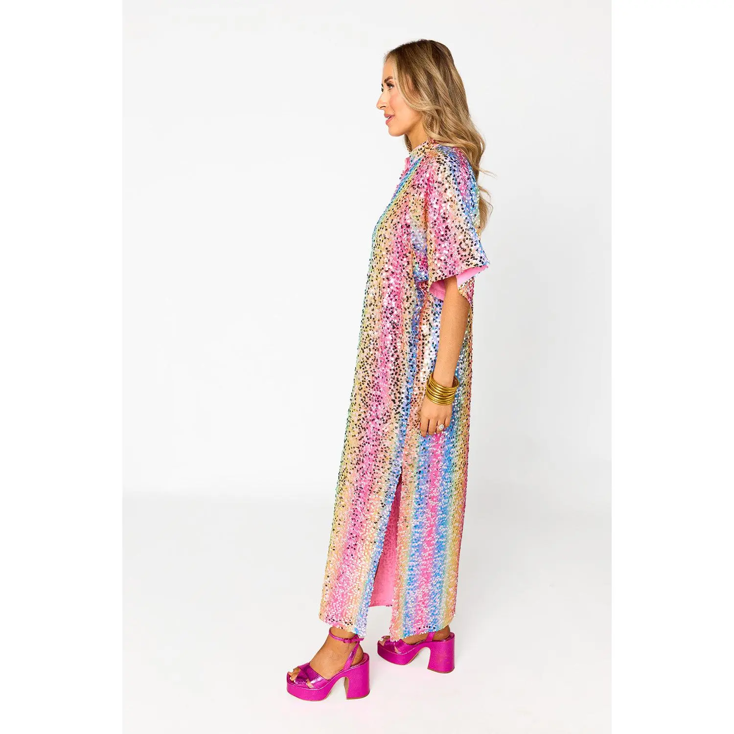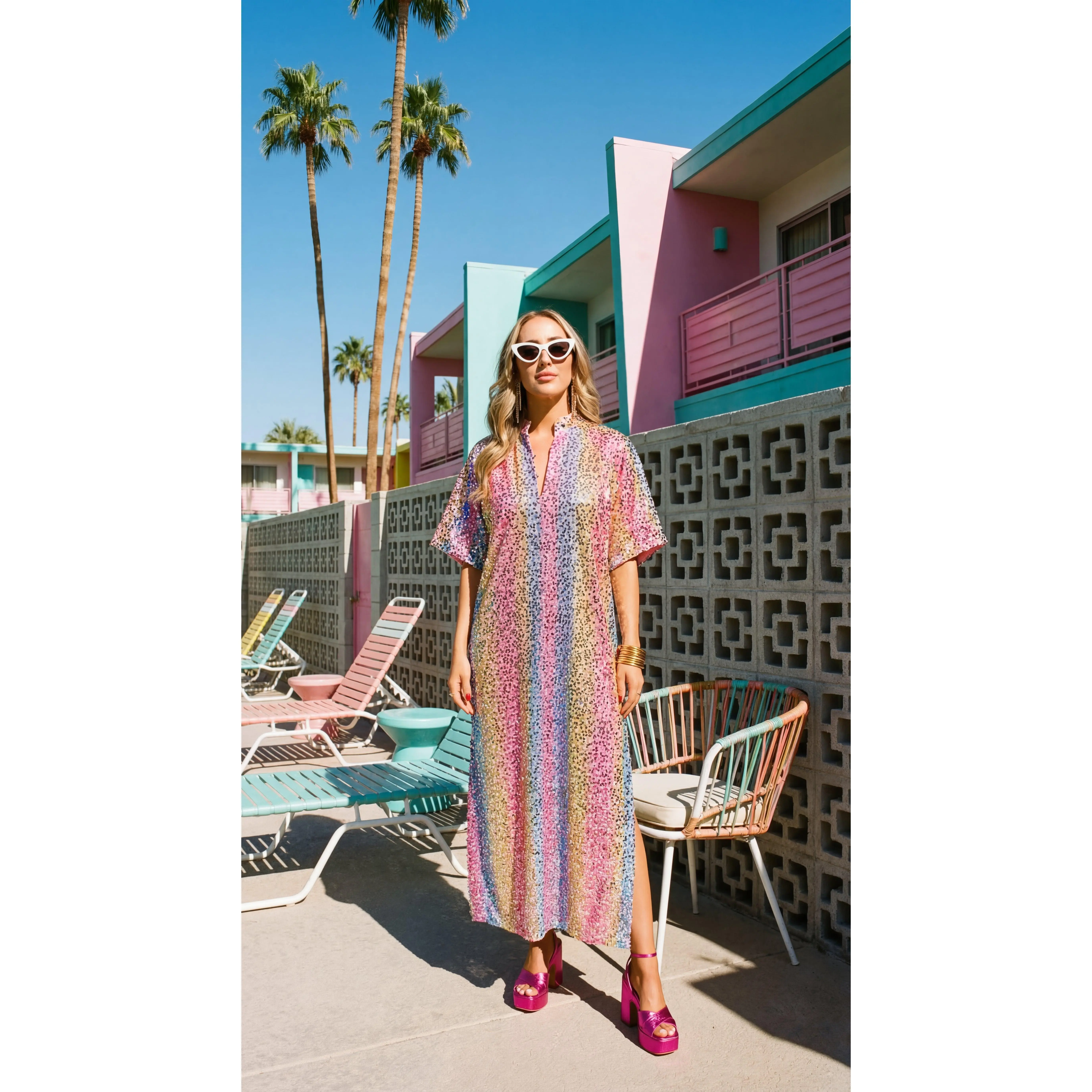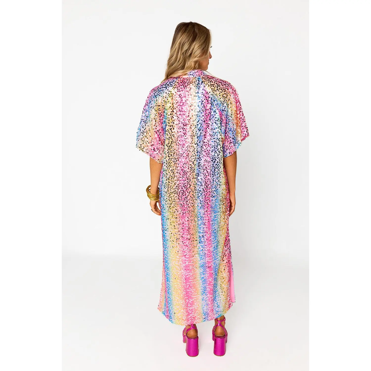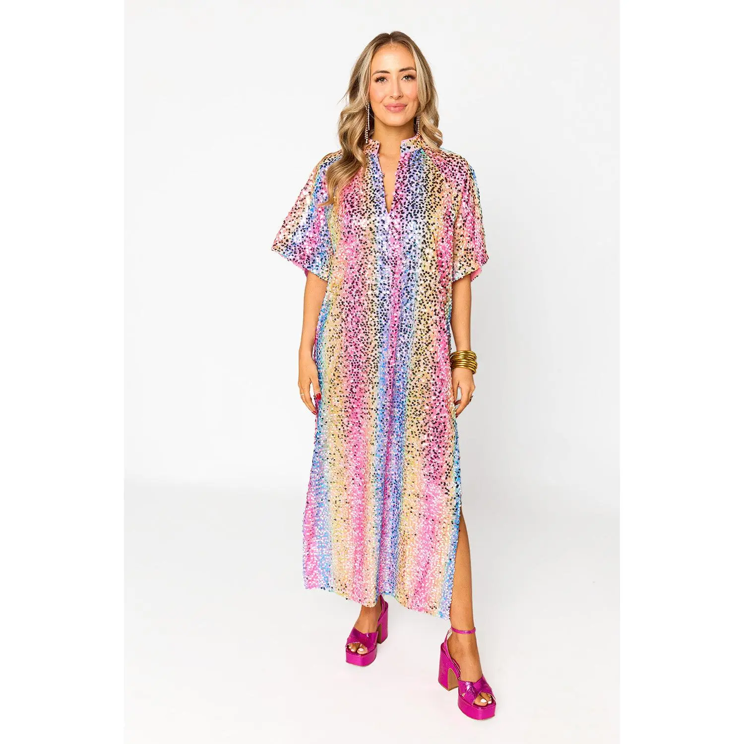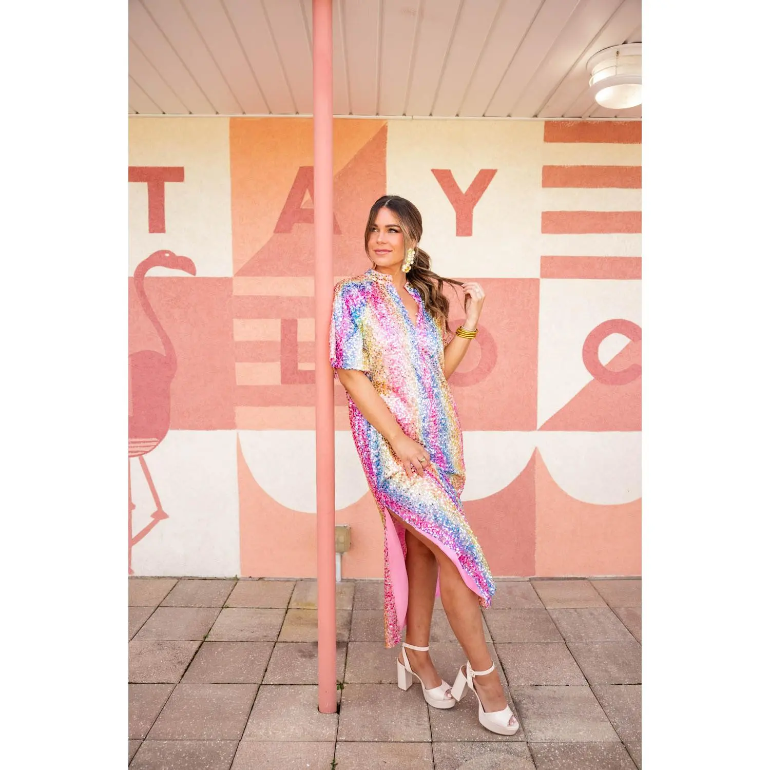 Our Leighton Midi Sequin Dress redefines your summer style! Her loose fitting silhouette, two slits right below the knees, and her STUNNING sequined pattern makes her a perfect addition to your wardrobe!