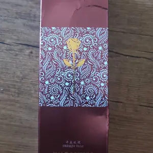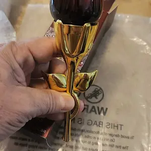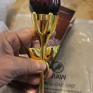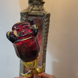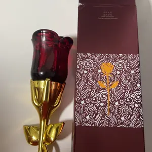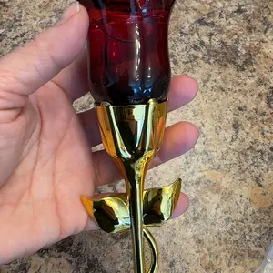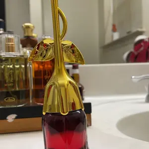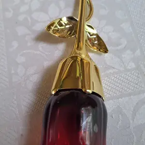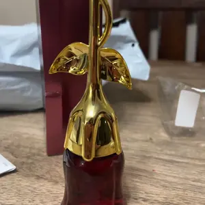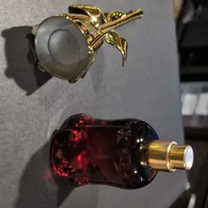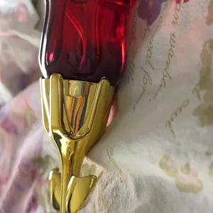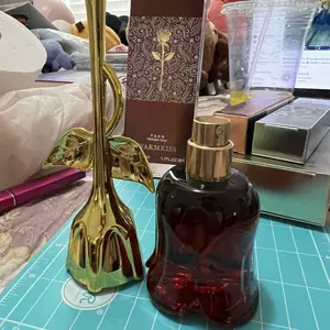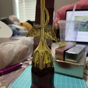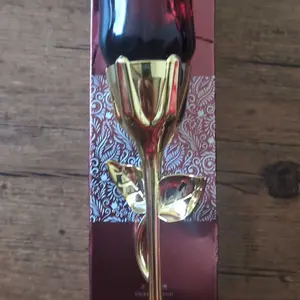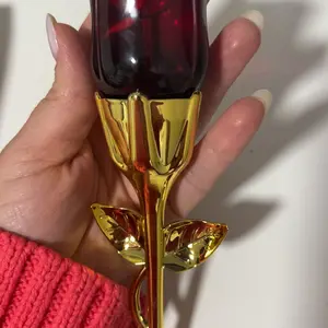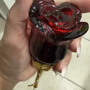 Came VERY securely packaged in lotsss of bubble wrap. Smells a bit old lady-ish but it’s got a nice musk to it if you’re into that. Very beautiful and good quality glass bottle for the rose part. I think the stem is some kind of plastic but it feels sturdy! It’s a good size and I’m overall pleased😊