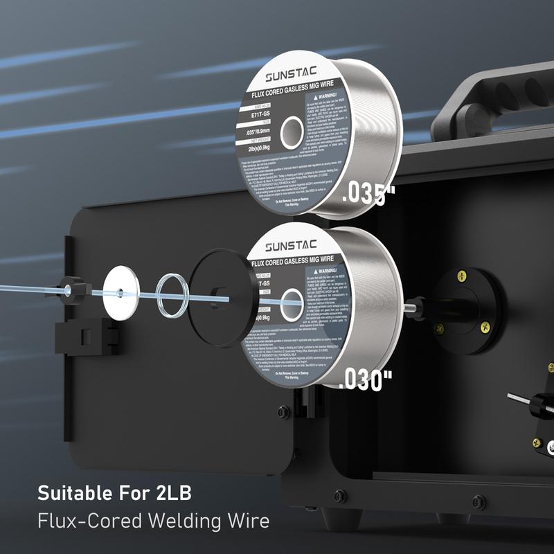 ·Supports .030" (0.8mm) and .035" (0.9mm) flux-cored wire in gasless MIG mode, accommodating 2-lb spools.
