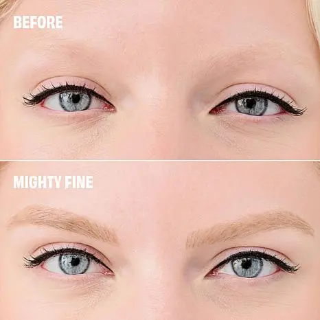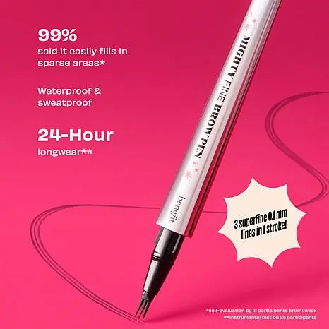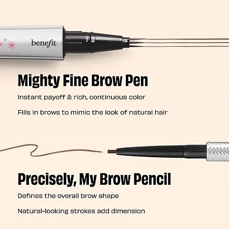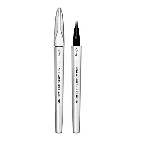 Benefit Cosmetics Mighty Fine Waterproof Brow Pen 2-pack What It Is This super-fine brow pen by Benefit draws on three superfine lines in one stroke, so you can get fuller-looking brows with a longwear formula.   What You Get (2) .01 oz. Mighty Fine Brow Pen What It Does 24-hour longwear Waterproof and sweatproof  Smudge-proof  Transfer-proof How to Use Shake, shake, shake! Hold the brush perpendicular to brows to get the finest lines. Flick upwards onto clean, dry brows. Hot Tip: Every so often, wipe brush tips gently across a clean tissue to keep them in tip-top shape.