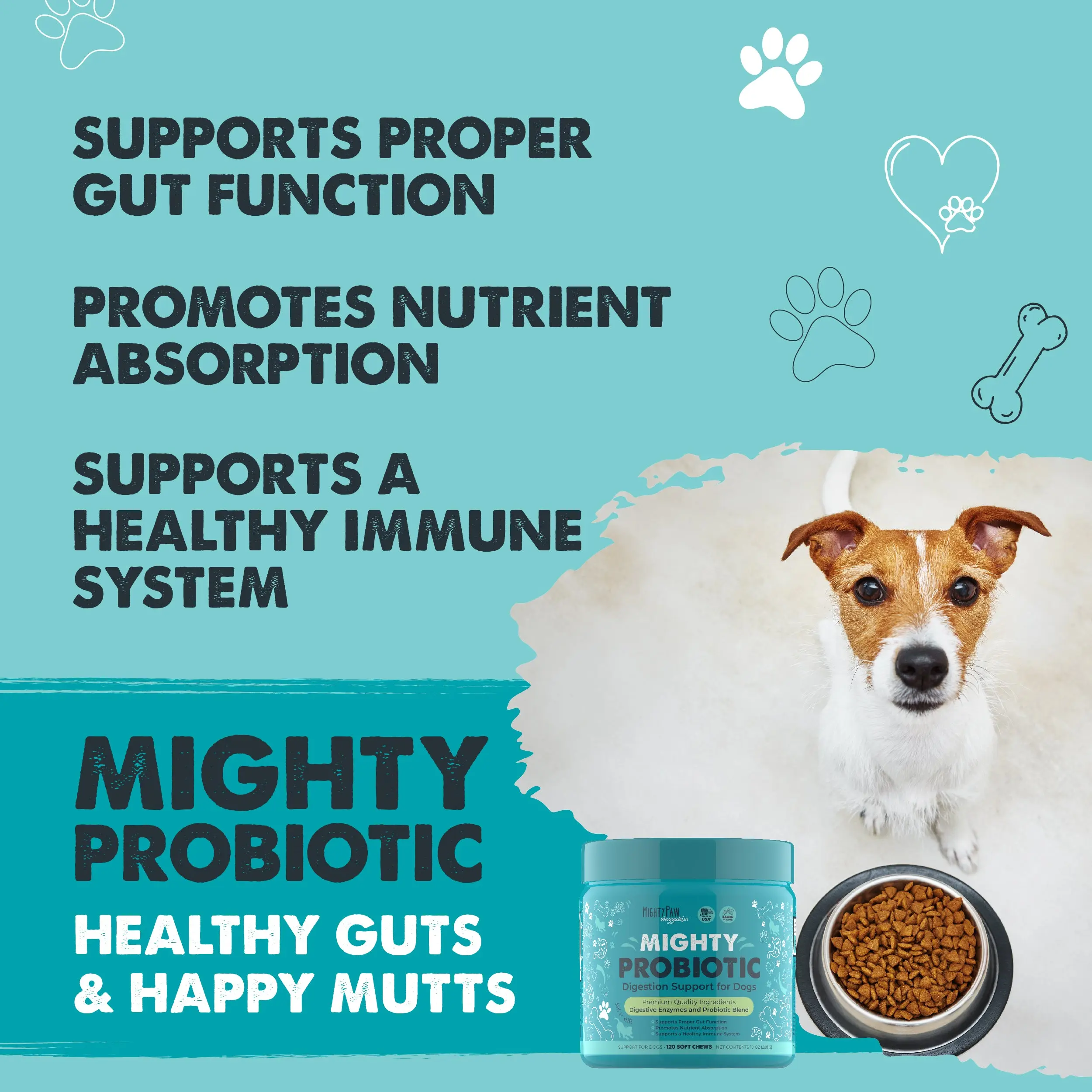 With a blend of probiotics and enzymes, Mighty Probiotic supports your dog's digestion. It's the right choice for your four-legged family member. Your dog will wag their tail in joy! 💪