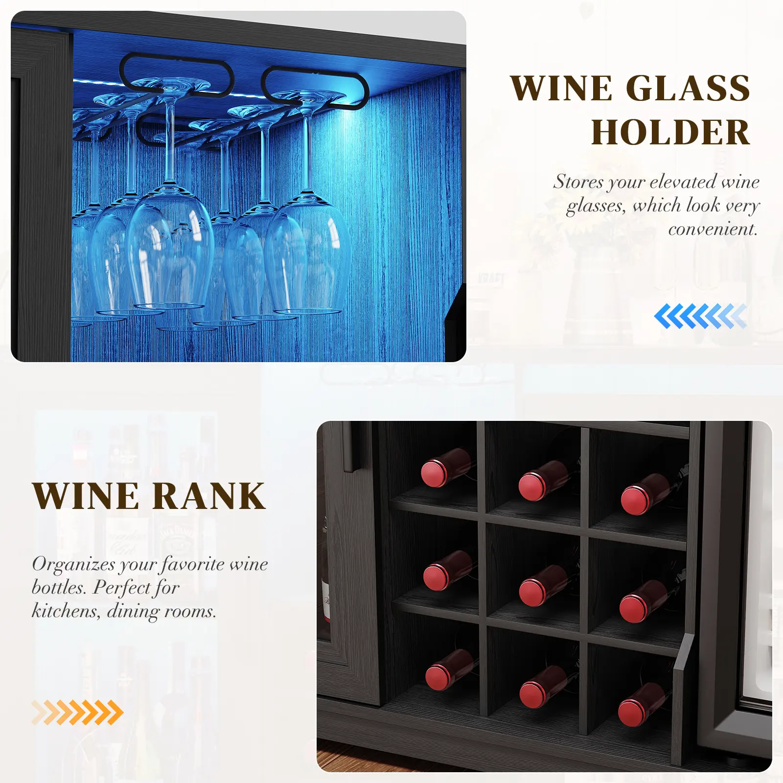 ·Ingenious Space Layout: Equipped with 9 wine racks, 2 glass holders, drawers, visual doors, extra storage cabinet, and fridge storage space, this farmhouse liquor cabinet keeps everything organized from bottles to glassware, kitchenware and more.