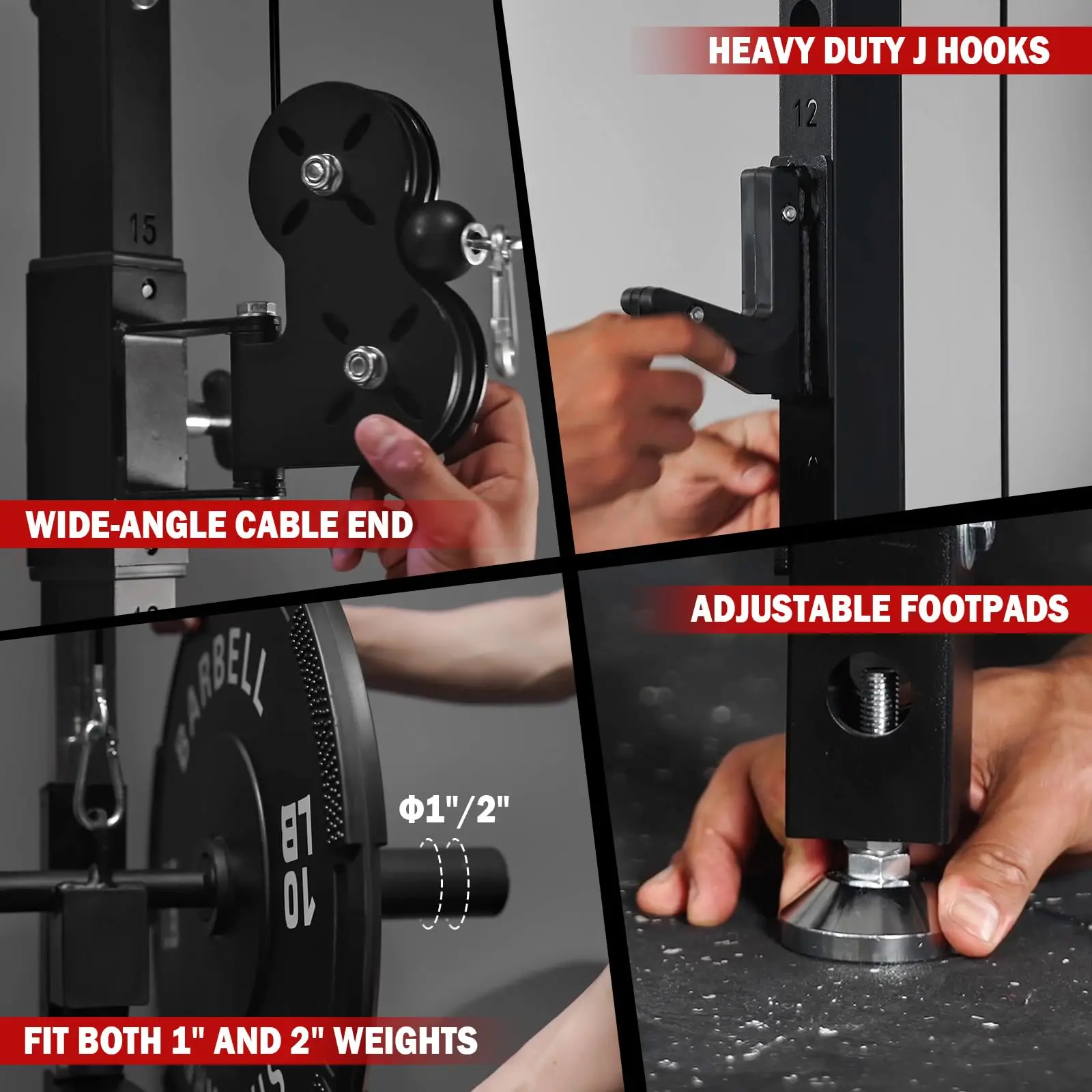 ·[FULL BODY WORKOUTS]: Complete with a detachable pull-up bar, premium J hooks, and a single-handed adjustable pulley system offering 15 height options, this squat rack home gym is designed for versatility and convenience. With over 80 different full-body exercises including squats, bench presses, seated rows, cable flies, bicep curls, kickbacks, and more, it's the perfect choice for fitness enthusiasts seeking a comprehensive workout experience.