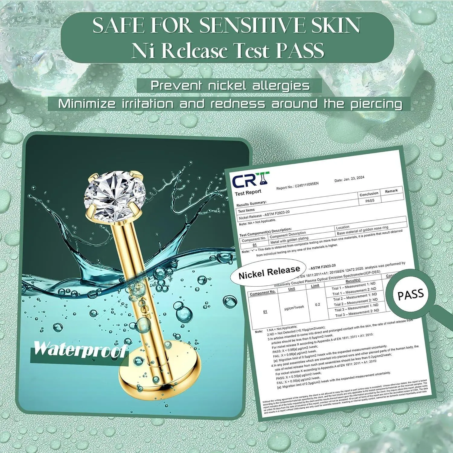 ·Threadless Push in Nose Rings:Gauge size: 20G(0.8mm) Bar Length: 6mm/7mm/8mm, CZ Diameter: 1.5mm,2mm,2.5mm,3mm, Color: 14K plated gold. Material: 316L stainless steel.One order includes 8PCS Labret Posts (3 different length ),8PCS different size of Threadless Ends, 1PCS Taper Insertion Pin.