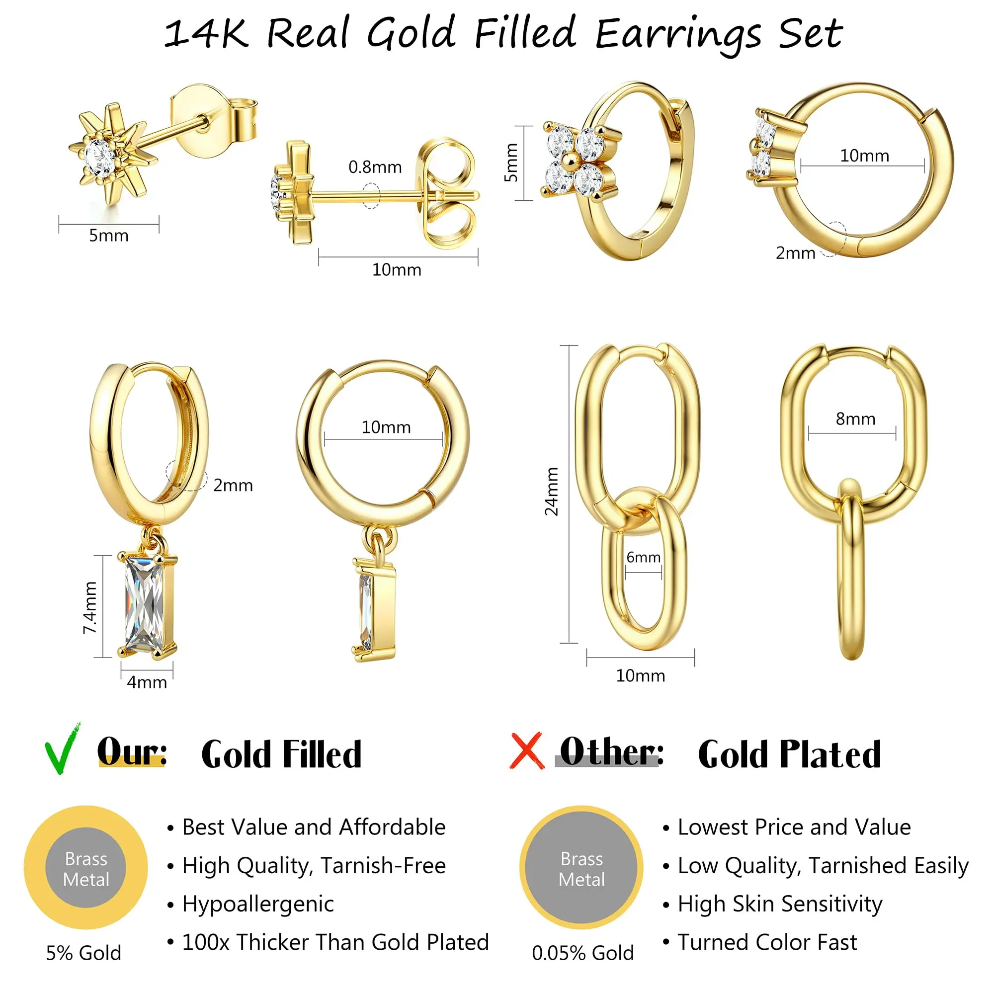 ·Non Tarnish 14K plated Gold Filled Earrings: Dainty gold earrings for women coated 5% 14K real plated gold on the gold earrings surface, make these gold stud hoop earrings shiny and textured, non-rust and not easy to fade, keep the earrings shiny for a long time, strong wear resistance and oxidation resistance, with a long service life, usually up to 5-10 years. Tarnish-resistant and durable 14k plated gold earrings set, perfect for long-term wear