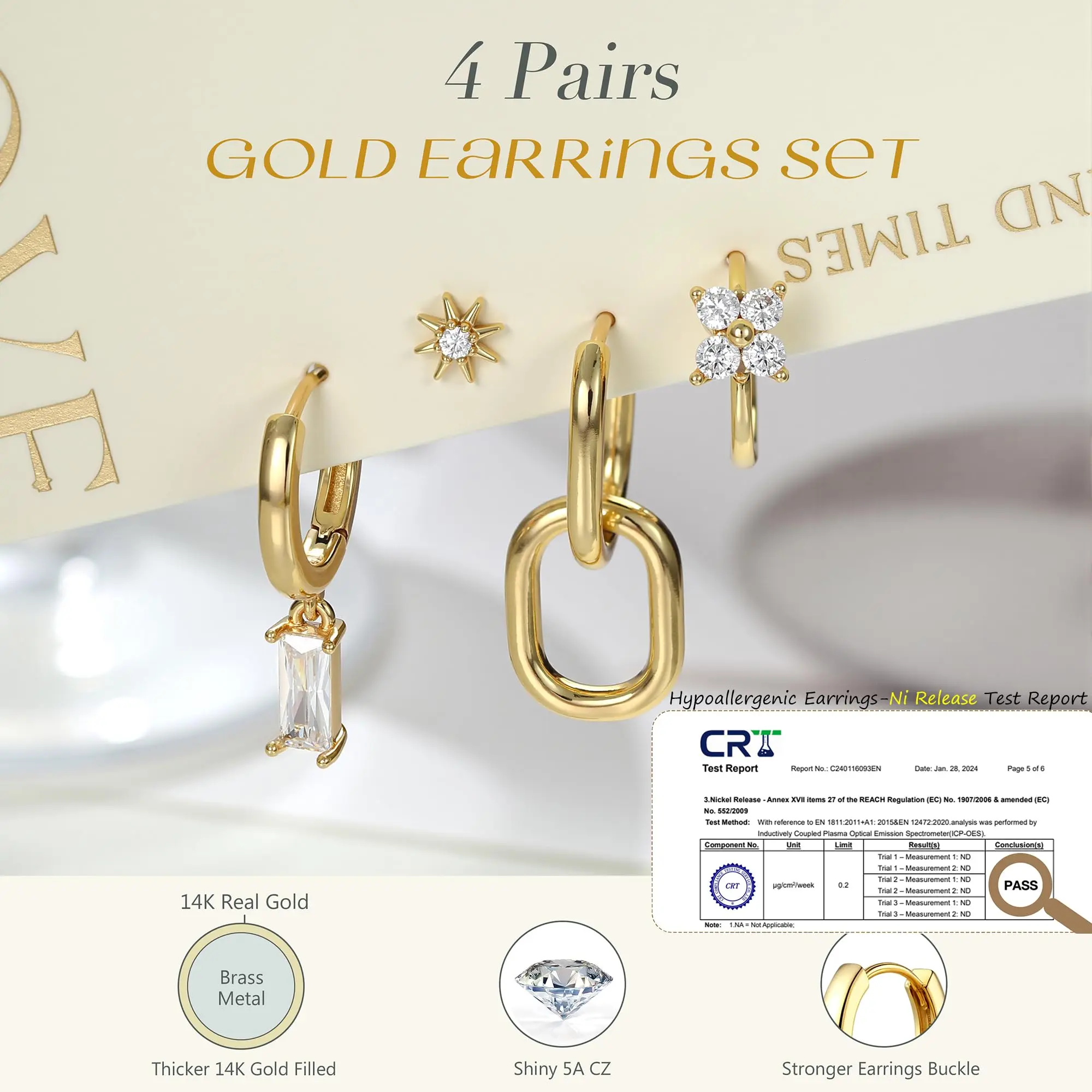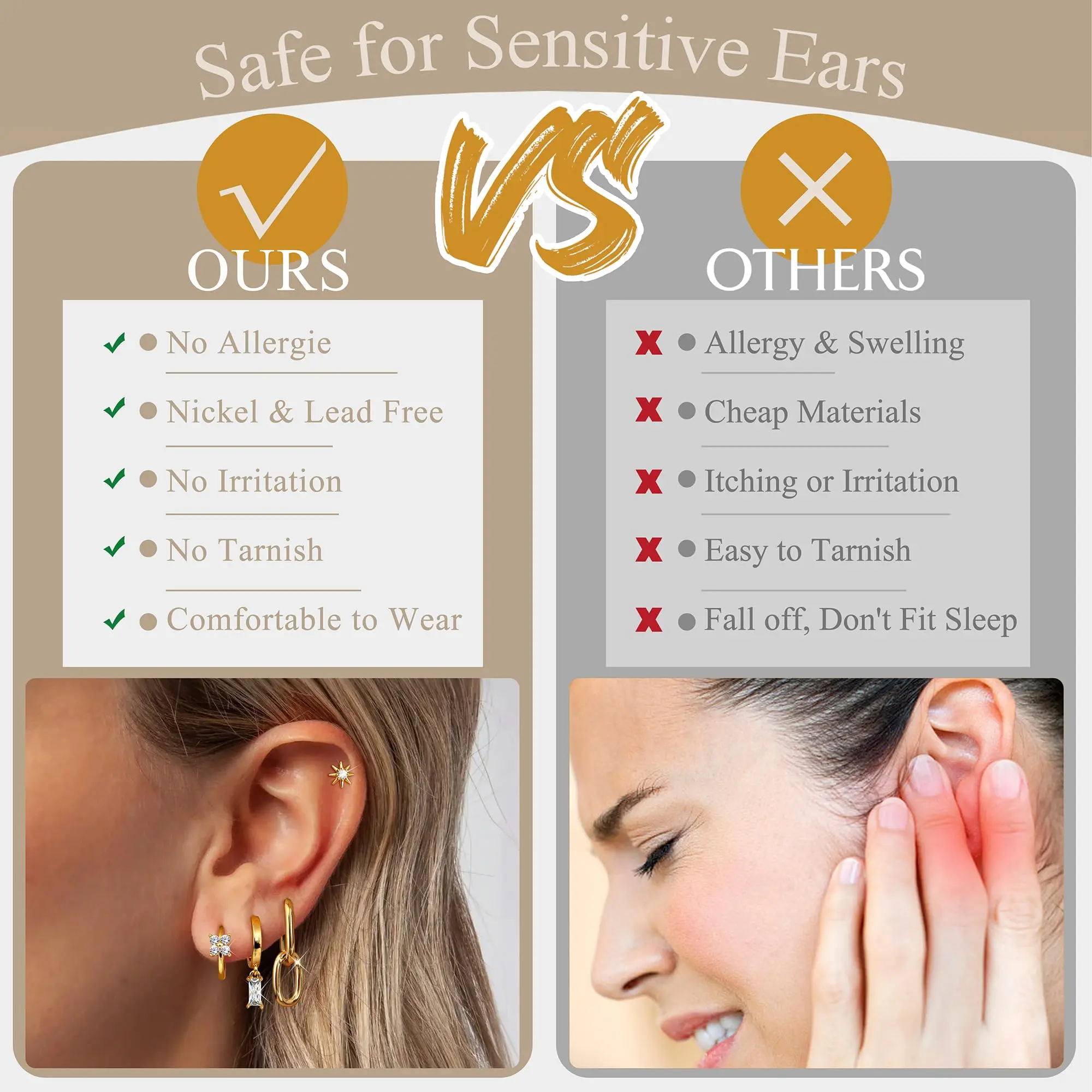 ·Hypoallergenic Earrings for Women: Crafted with sensitive ears in mind, these gold earrings for women are made of high quality brass, has been rigorously tested for nickel content and validated by over 30 women with sensitive skin, none of them got discomfortable, ensure these gold earrings are real hypoallergenic, lead-free and nickel-free, suitable for sensitive ears, no worry about irritation and rashes, are good earrings