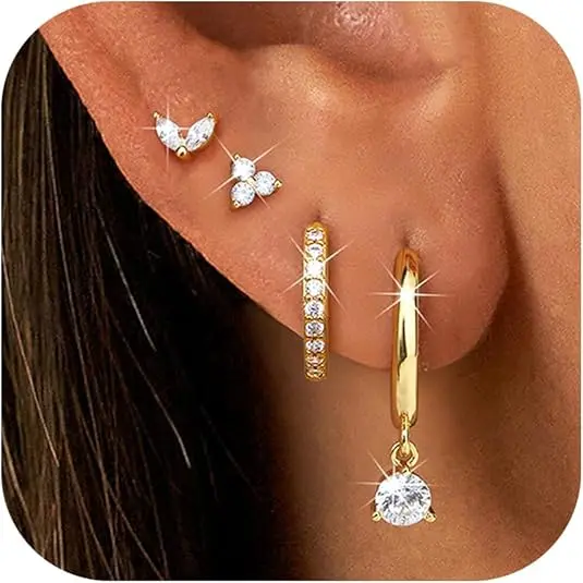 ·Dainty Gold Earrings Stacks: This 4-pair gold earrings set for women trendy includes 2 pairs of chic cz stud earrings and 2 pairs of small gold hoop earrings (small cz hoop earrings, huggie hoops with charm), brings a new look to the ears, different styles of gold earrings can be adjusted to the ears at will, very suitable for multiple ear holes to achieve a perfect stacks match