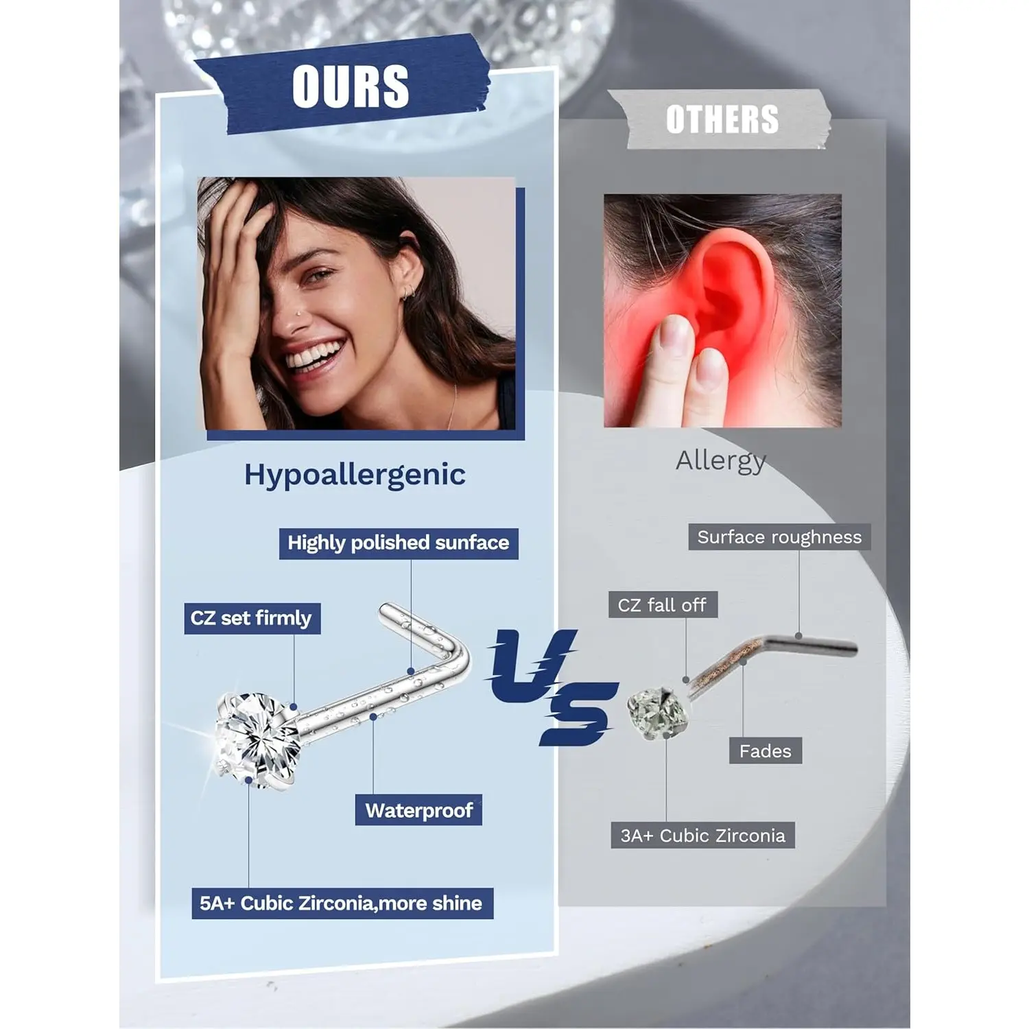 ·Premium Quality - These Hypoallergenic Nose Ring Pack Are Made Of 316l Surgical Steel And Sparkling 5a Cz. Lead Free, Nickel Free And Cadmium Free, Resist Rust And Resist Corrode; High Polished Smooth Surface, Do Not Scratch Your Skin