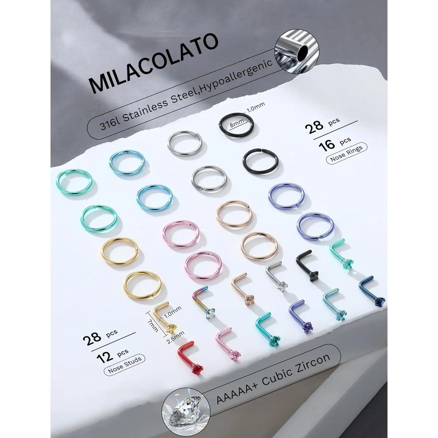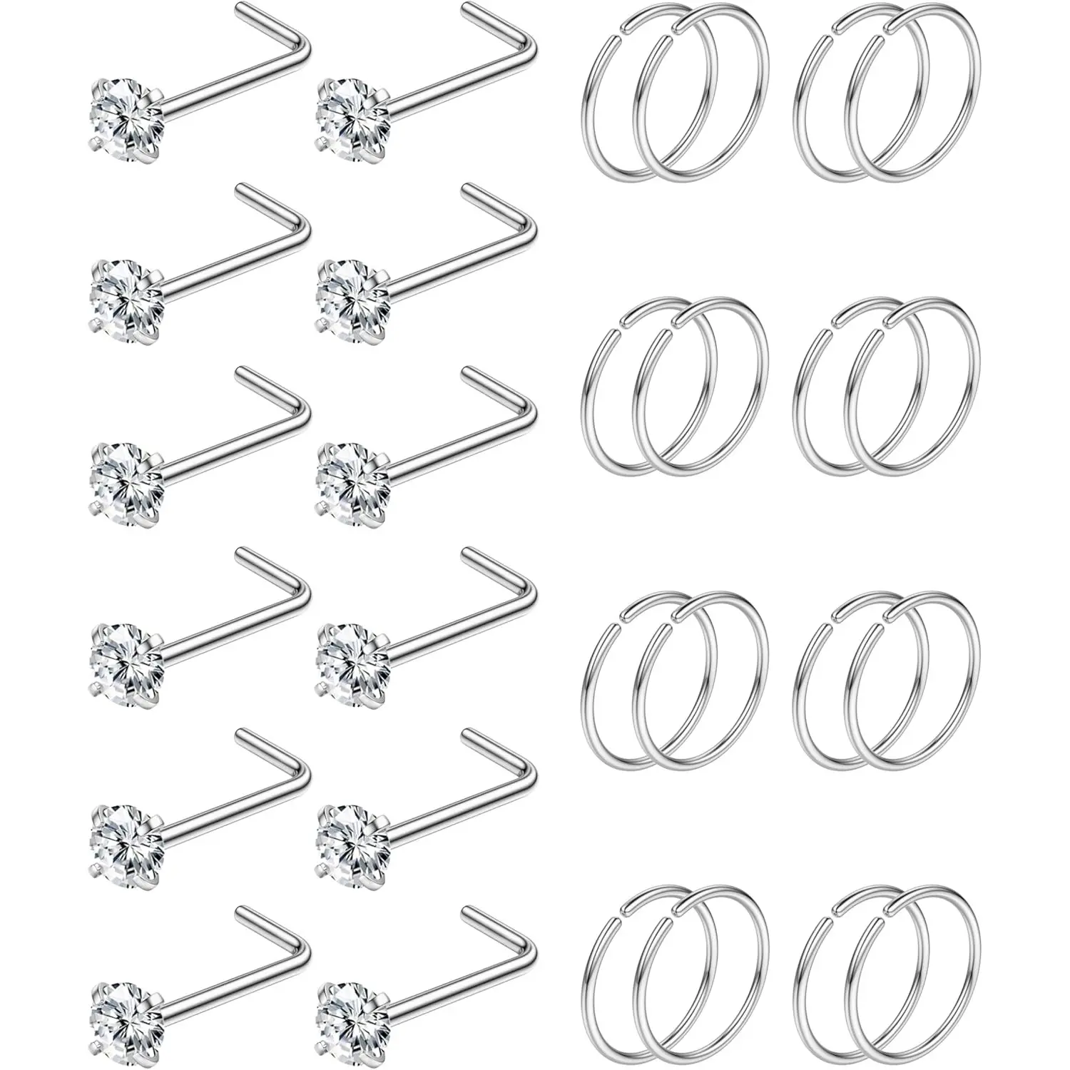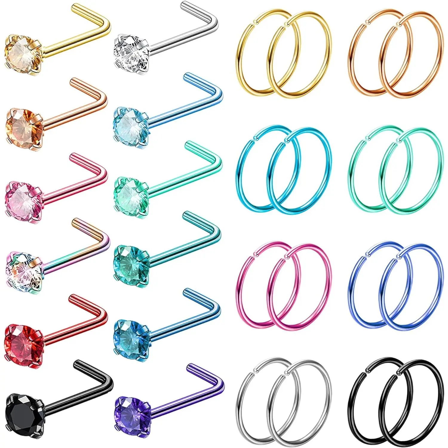 ·Nose Piercing Jewelry Set - A Set of 28 PCS Stainless Steel Nose Rings. Including 12 PCS L Shaped Nose Studs, 16 PCS Nose Rings Hoops. Available in 7 Color Set (Silver 14K Plated Gold Rose14K Plated Gold Black Rainbow), Meet Your All Daily Needs