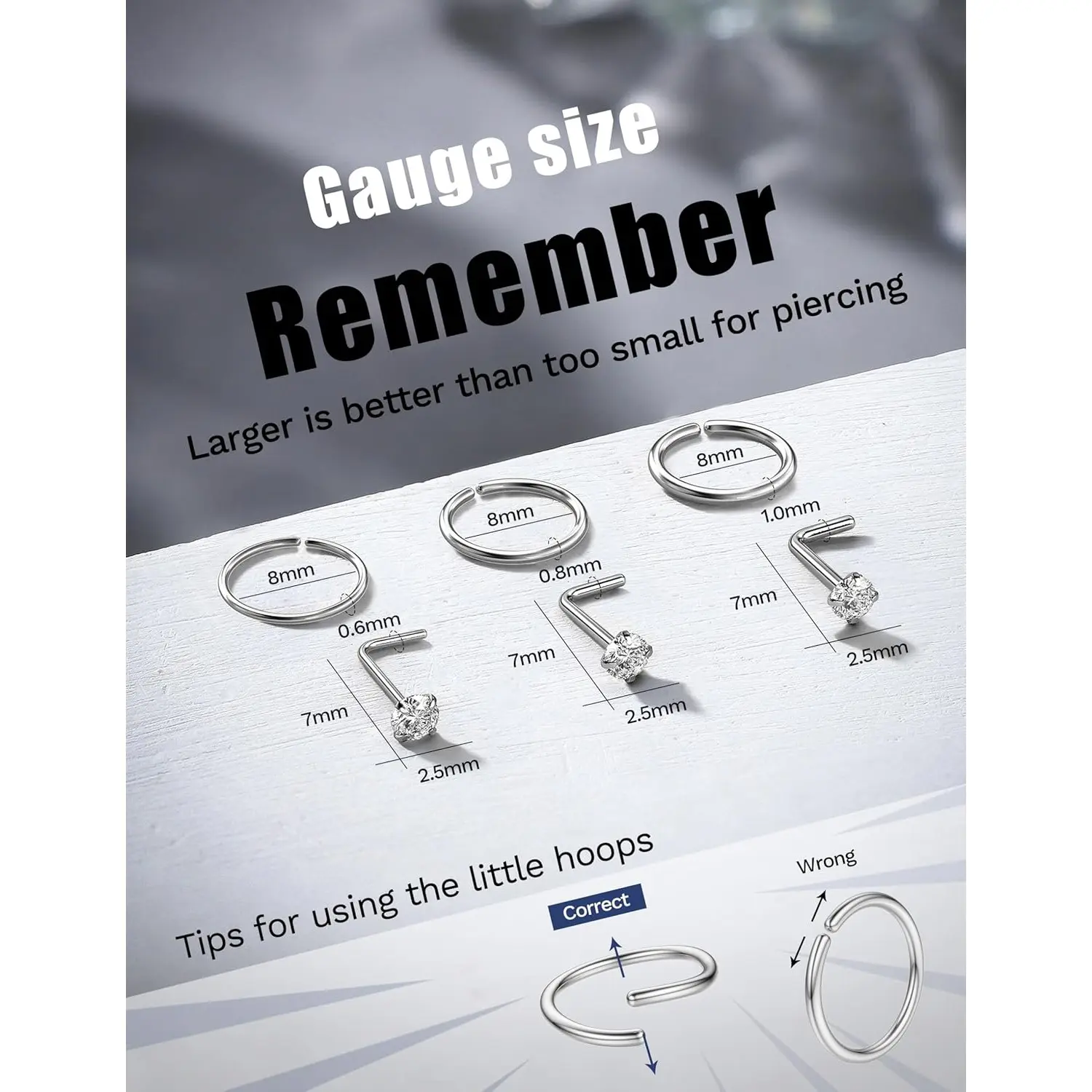 ·Gauge Size - Nose Rings Stud 7mm / 0.28" Length. Nose Hoop Inner Diameter 8mm, 18g(1mm)/20g(0.8mm)/22g(0.6mm). Perfect Size for Most Women And Men