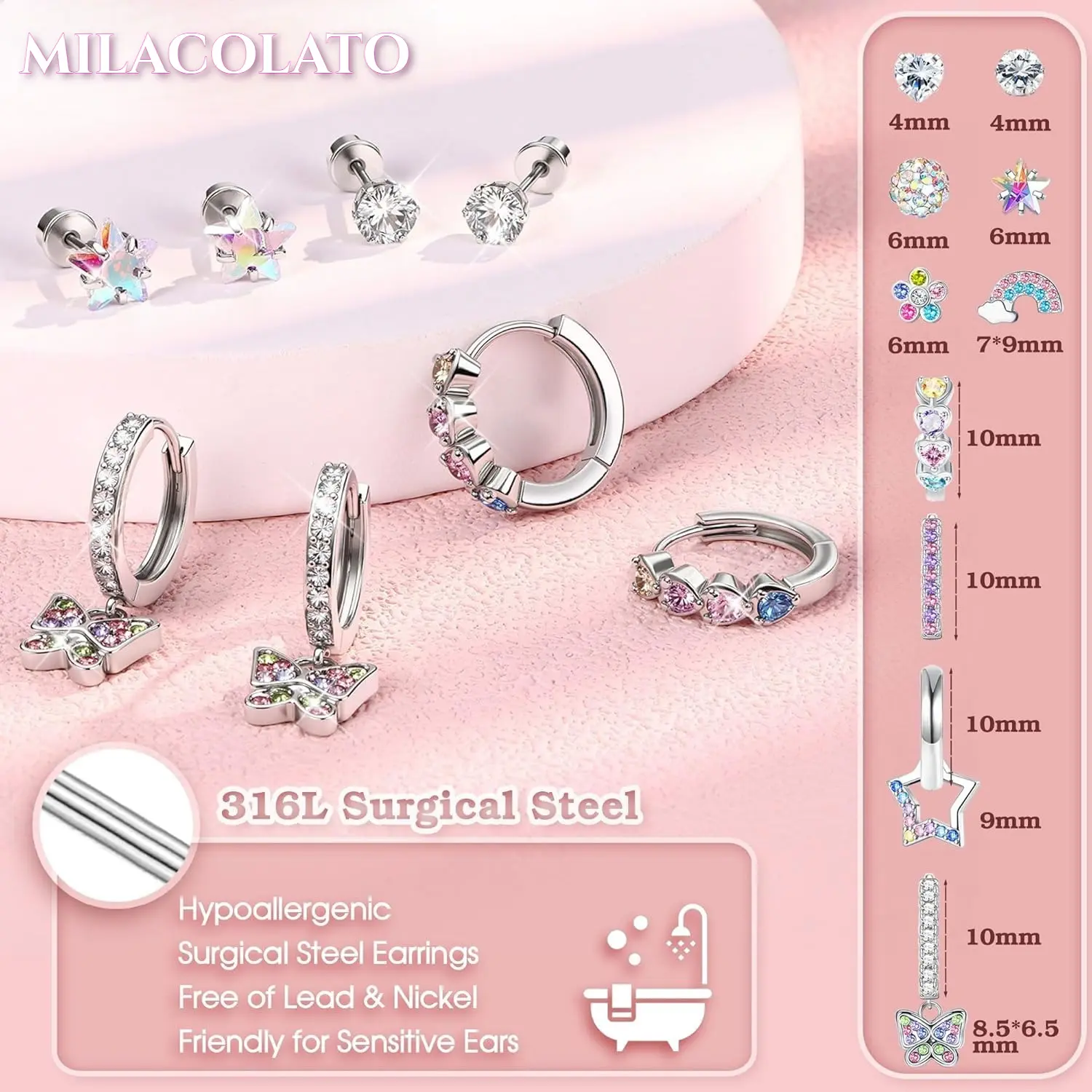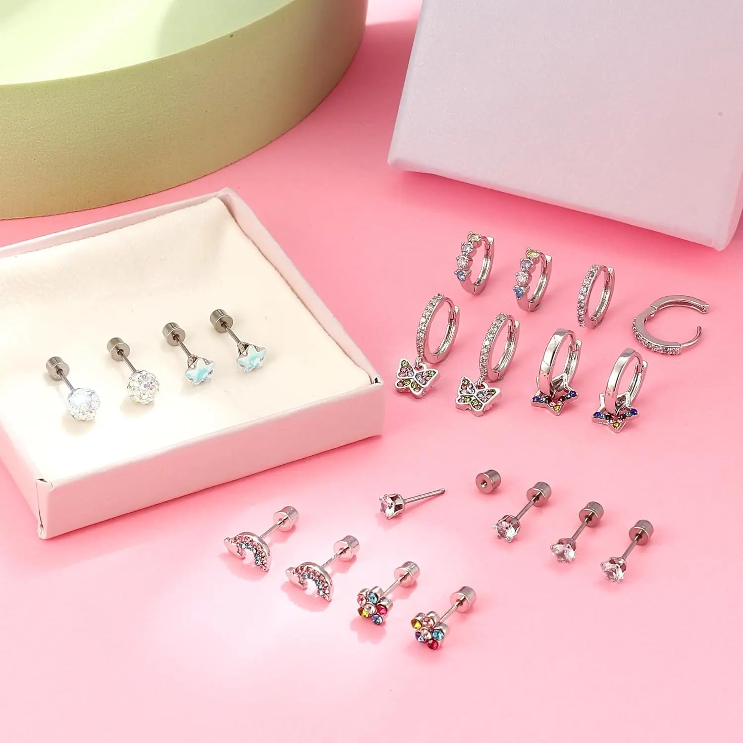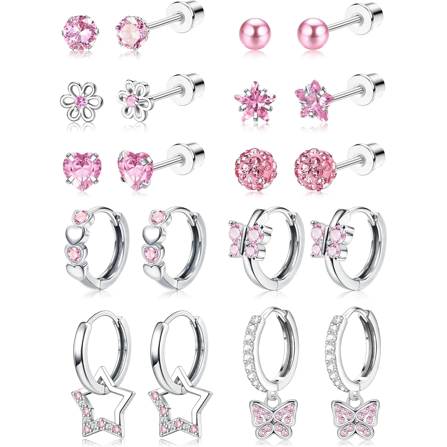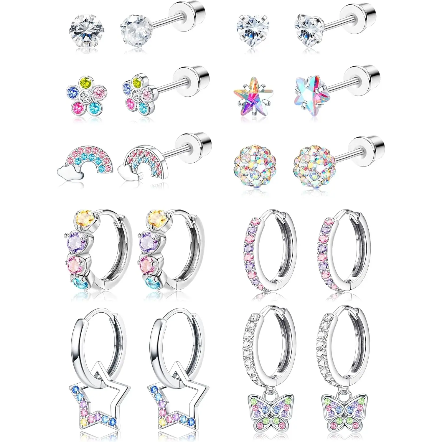 ·Cute Screw Back Earrings Set: You can get 10 pairs hypoallergenic screw back earrings for girls women in one set, including 6 pairs cute screwback stud earrings, 2 pairs small huggie hoop earrings and 2 pairs dangle hoop earrings for girls. Versatile styles and colors, more options for different outfits, economical set which deserves your buying.