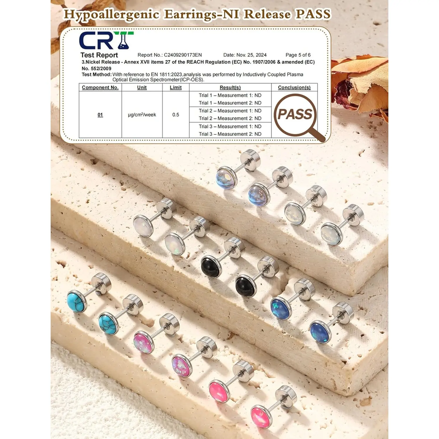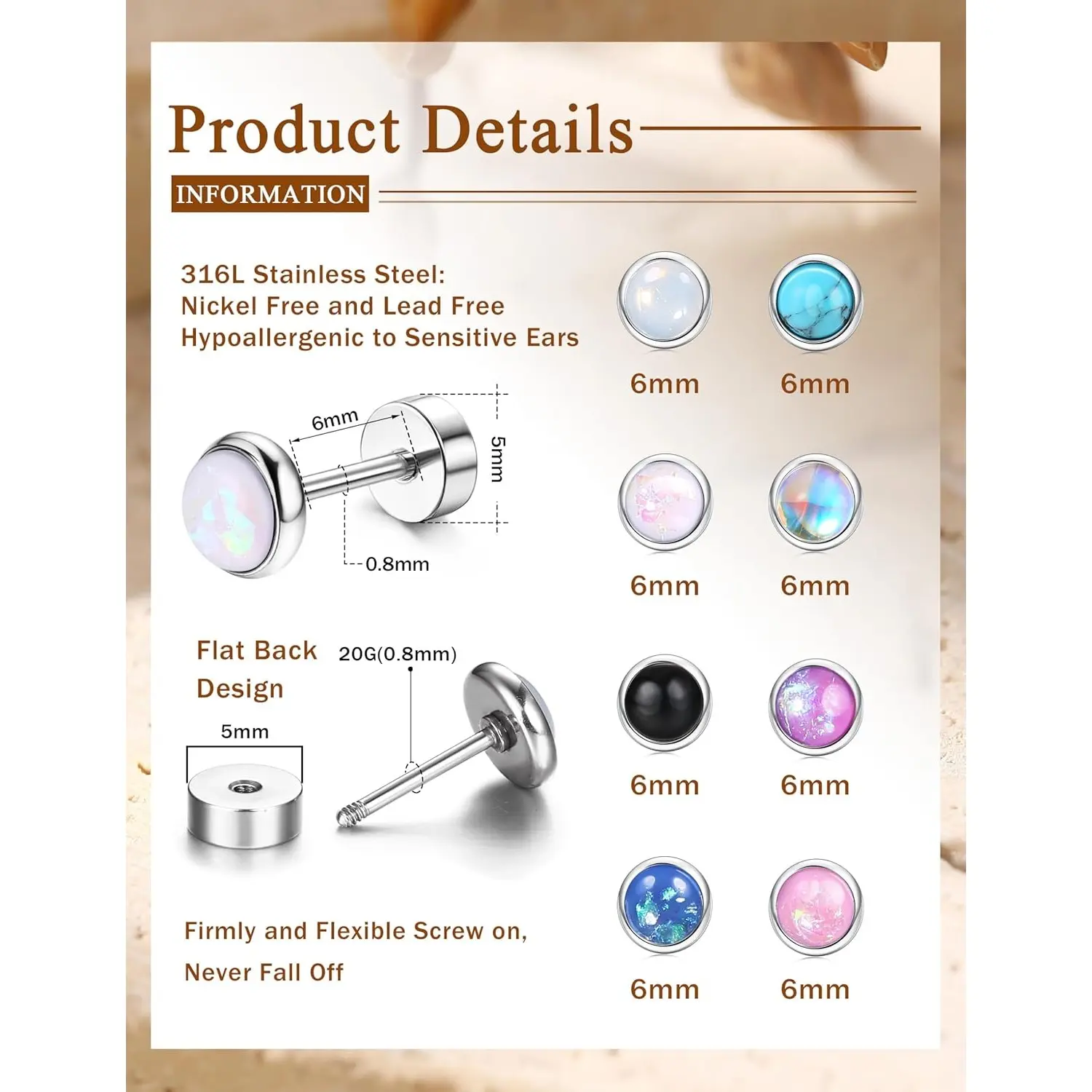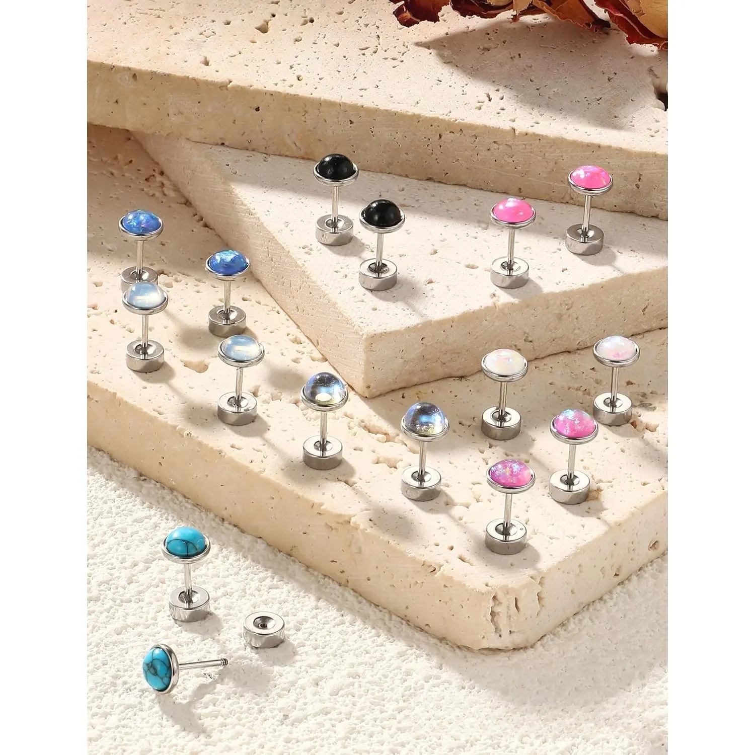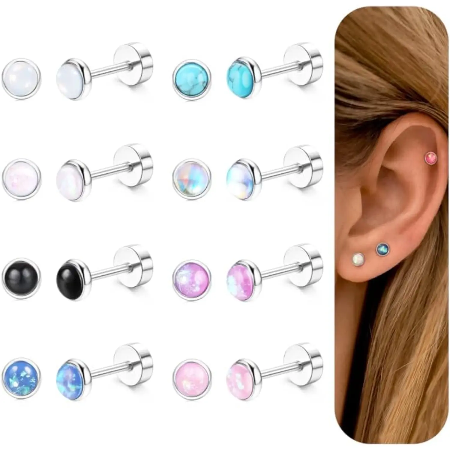 ·STUD EARRINGS SET: Each order includes 8 pairs of flat back earrings, featuring a variety of styles such as Opal, Moonstone, Turquoise, and Obsidian. These earrings are designed to meet the diverse outfit needs of both men and women.