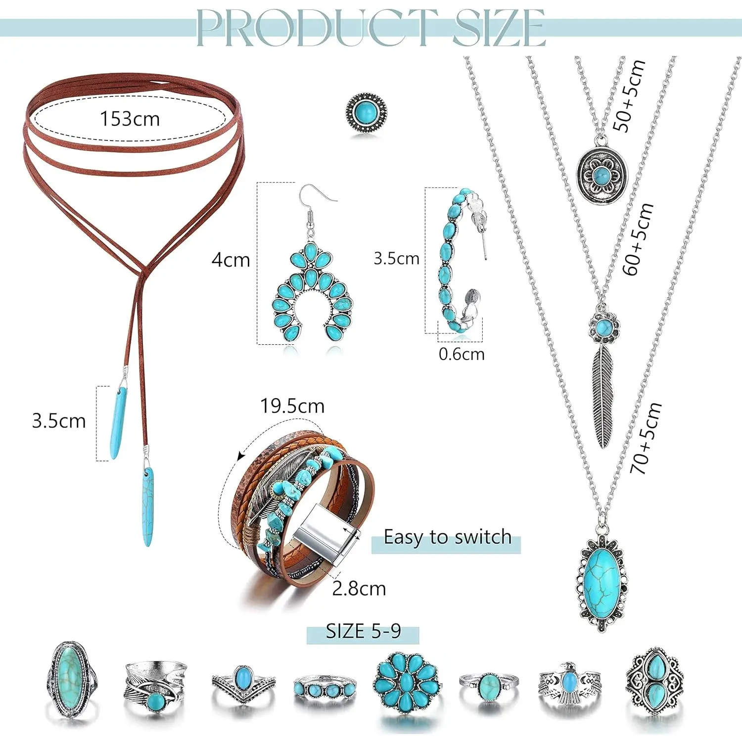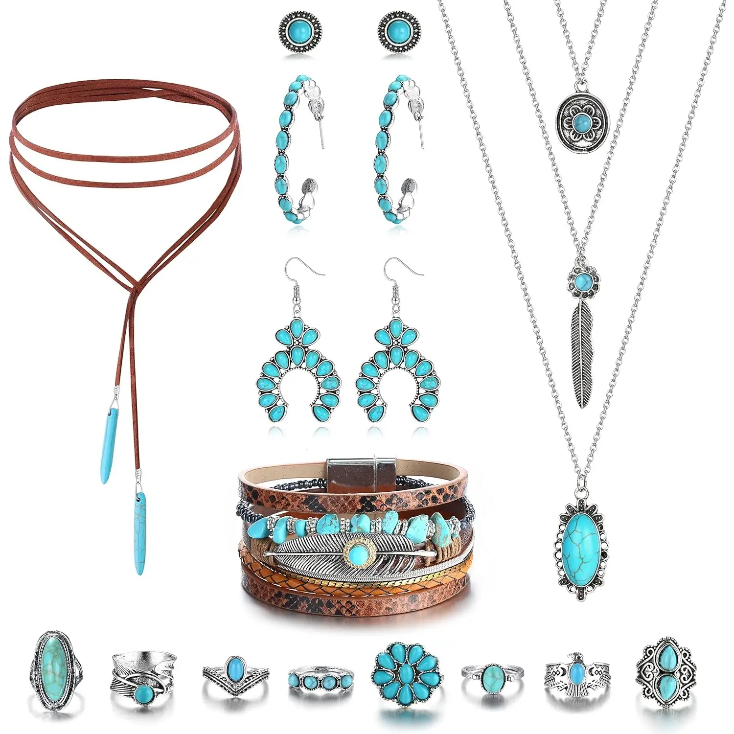 ·【Western Jewelry Set】: One western jewelry set contains 2 pieces turquoise pendant choker necklaces,1 piece turquoise multi strand bracelet for women,1 pair turquoise stud earrings,2 pairs turquoise hoop dangle earrngs and 8 pieces turquoise vintage stacking knuckle rings. Special western boho designs bring unique freshness to your daily outfits.