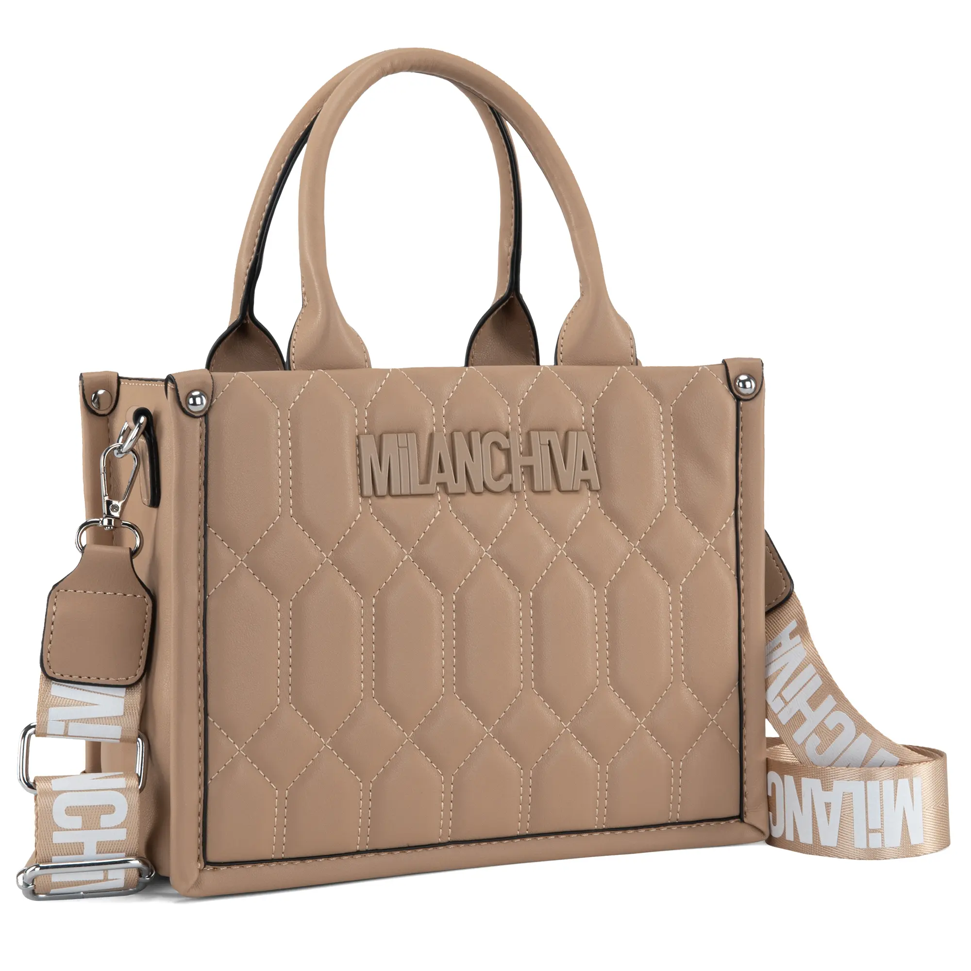 This bag is perfect! Material is soft, handles are strong, stitching is quality. The crossbody strap is very nice! It is the perfect size for the essentials you want to carry. The color is perfect to dress up or dress down. Highly recommended purchase!
