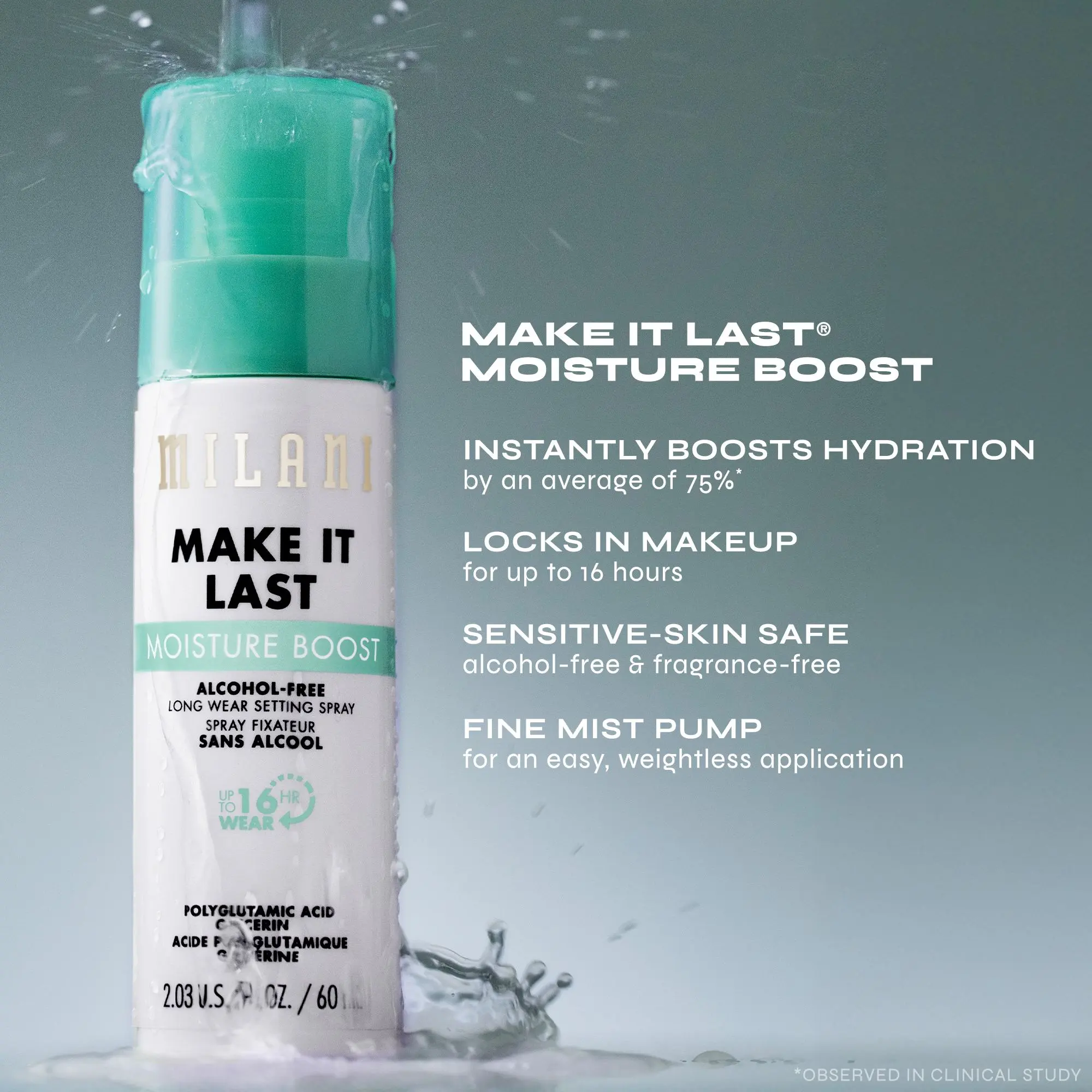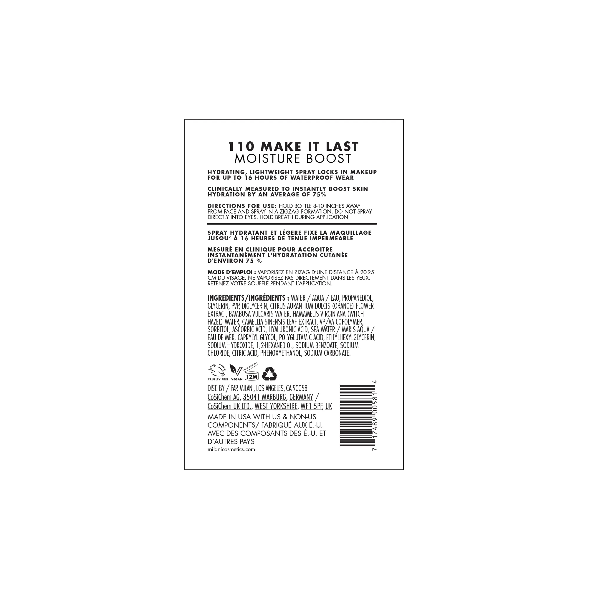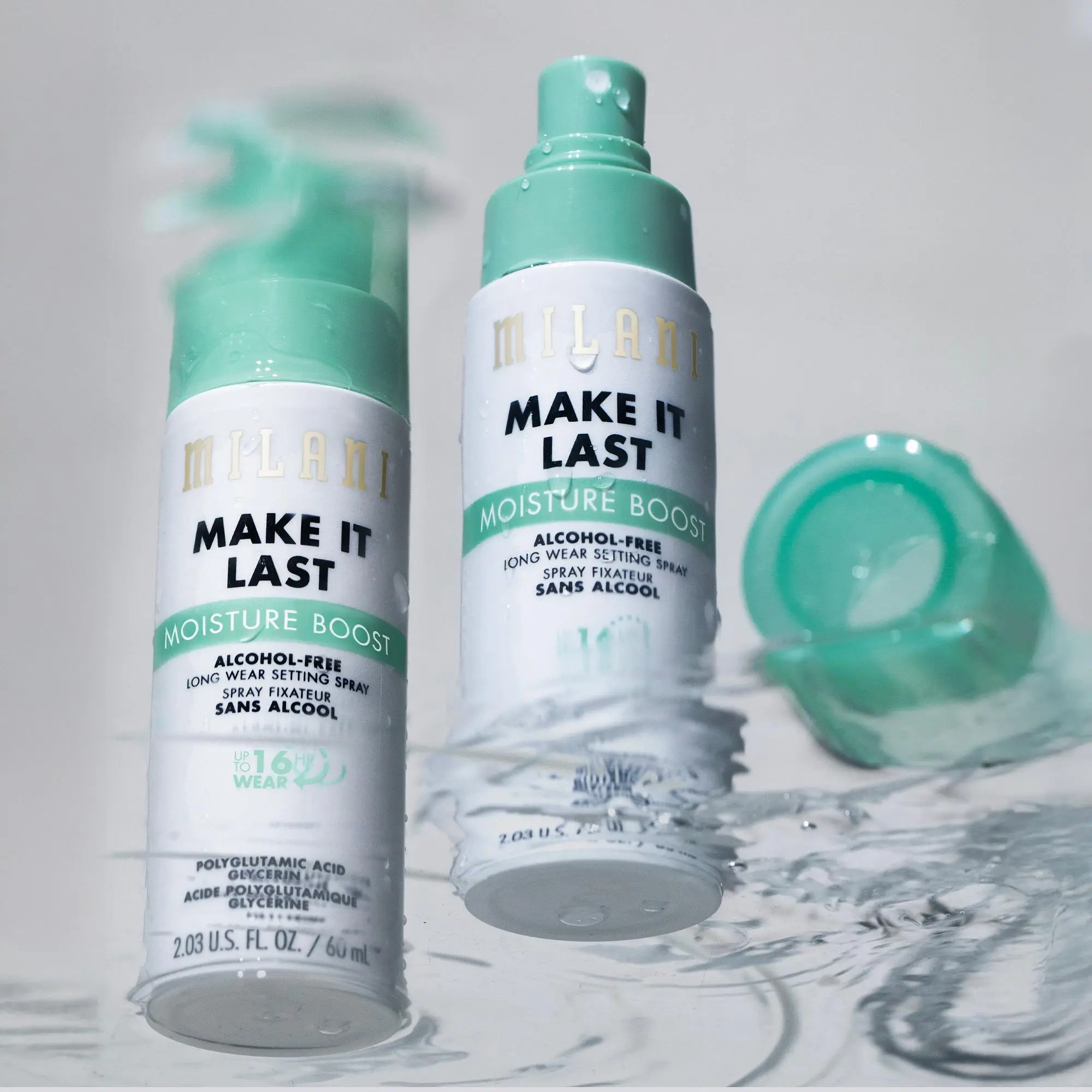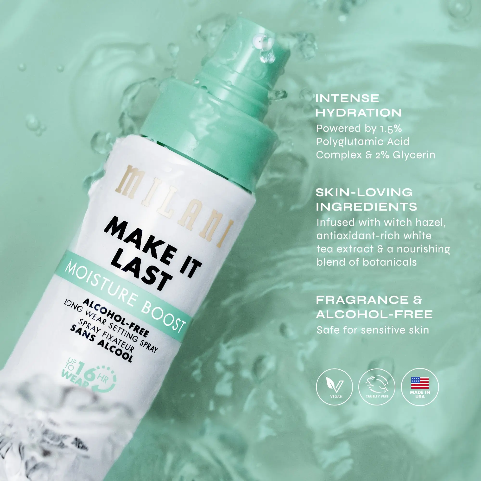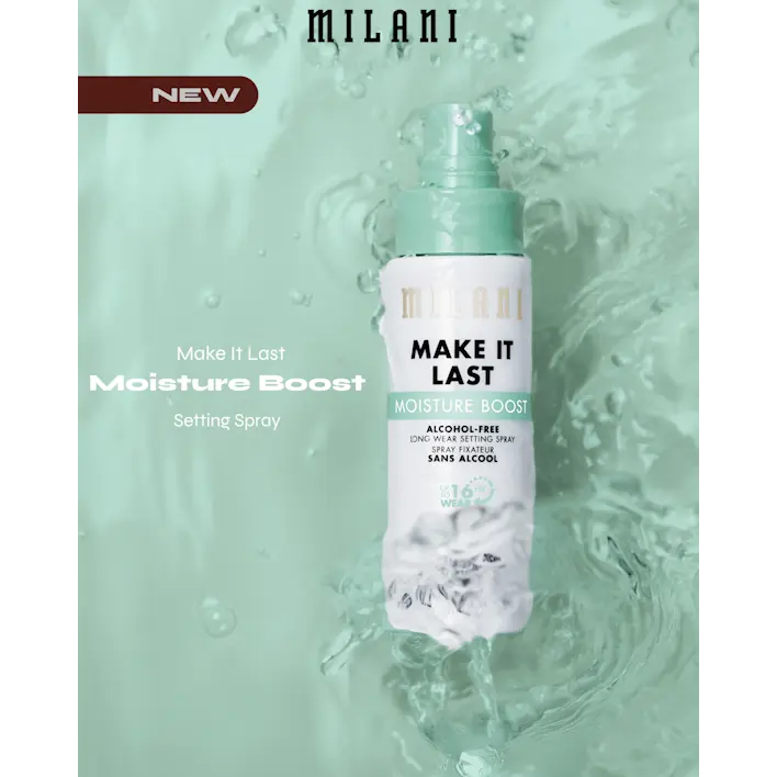 Say hello to hydration! Milani Make It Last Moisture Boost Alcohol-Free Setting Spray joins the cult-favorite collection boasting serious skin-loving benefits. Fragrance-free and safe for sensitive skin, this waterproof formula locks in makeup for up to 16HRs of wear*. Delivering a weightless, non-sticky fine mist, Make It Last Moisture Boost is infused with moisture heroes 1.5% Polyglutamic Acid Complex & 2% Glycerin. These humectants are powerhouse ingredients that attract & lock in intense moisture. Also featuring Witch Hazel, antioxidant-rich White Tea extract, and a botanical blend of Orange Blossom, Bamboo & Lava waters, this skincare-forward setting sets makeup all day while hydrating, soothing & refreshing the appearance of skin.