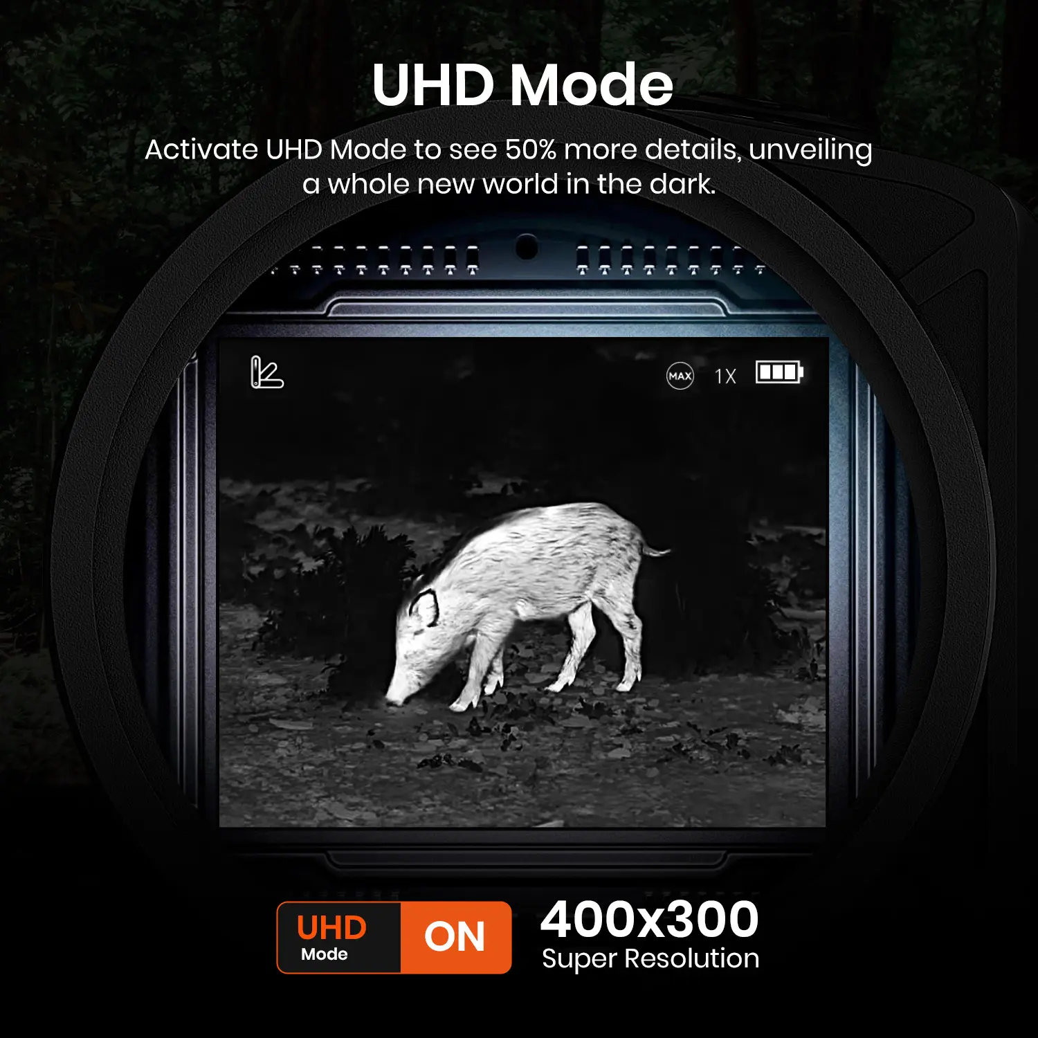 ·【UHD MODE CLARITY】The upgraded UHD mode unlocks enhanced night vision detail with advanced image optimization. Compared to standard thermal monocular imaging, it reveals up to 50% more definition—making complex outdoor textures like grass, brush, or water easier to interpret, even under low-contrast heat signatures.