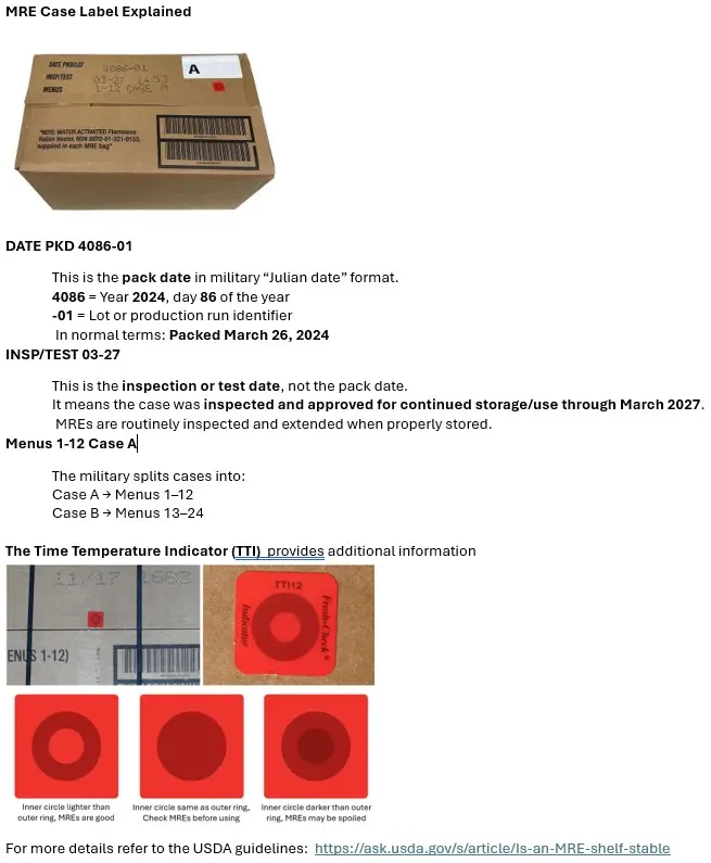 These are genuine military standard - Military MRE cases and are intended to last for extended periods of time. Each Military MRE case is stamped with all applicable dates and have a Fresh-Check Indicator on each box, ensuring they have been properly stored and maintained for the longest possible shelf life.