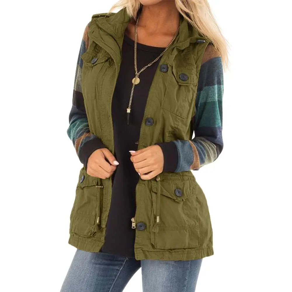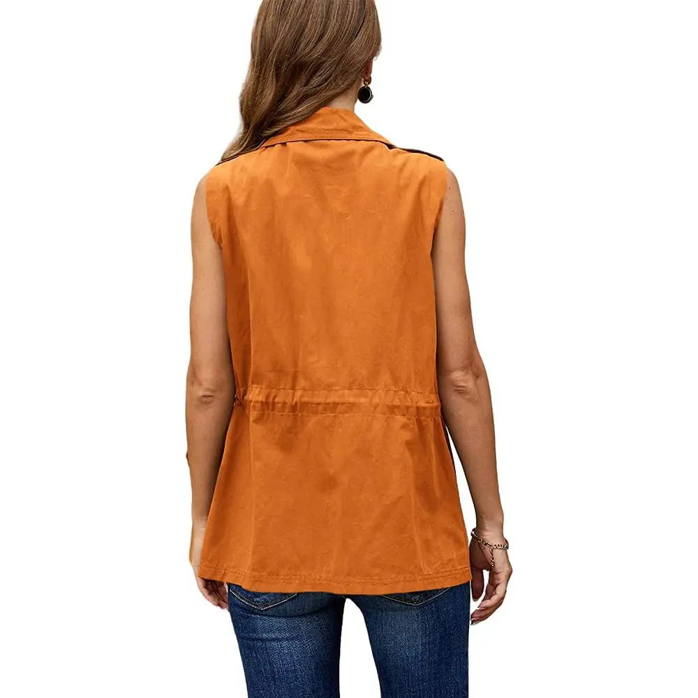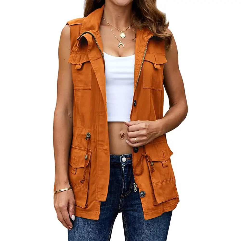 Womens Casual Denim Vest Zipper Drawstring Sleeveless Anorak Vest Jackets