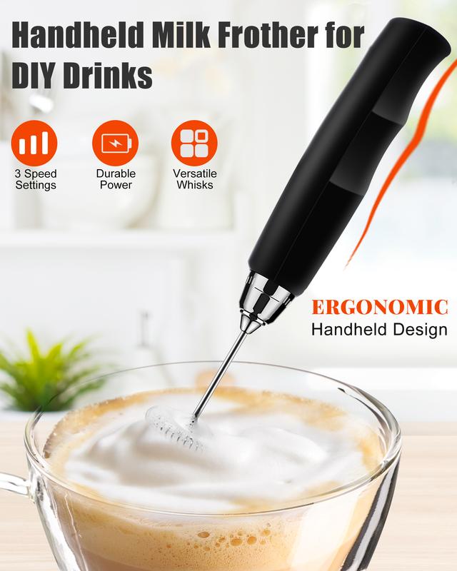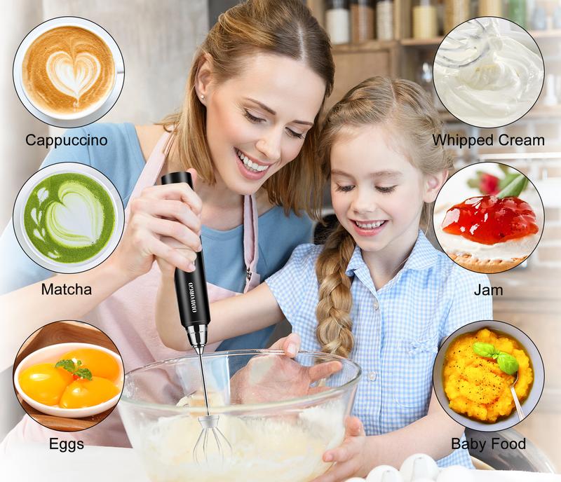 ·【High-Quality Milk Frother】The detachable frother whisking head is made of food-grade premium stainless steel, easy to clean. The coffee foam maker wand is made of food-grade ABS with an easy and comfortable grip. The built-in powerful low-noise motor brings strengthened speed rotation without disturbing your families and gives you a calm and tranquil morning.