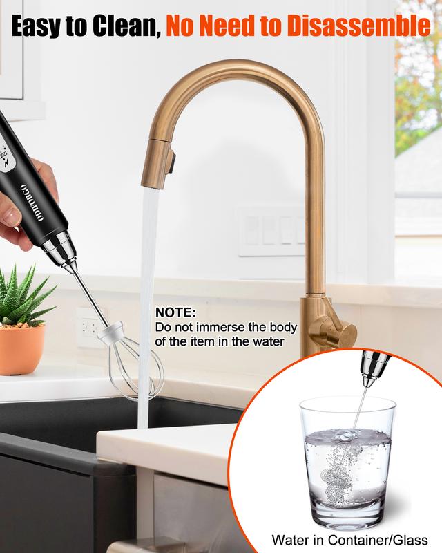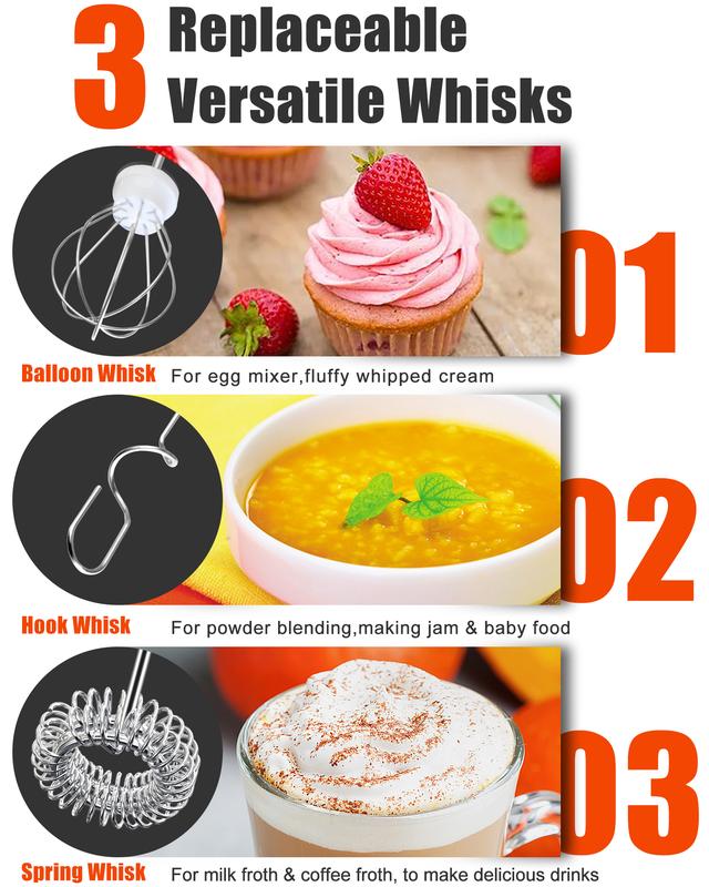 ·【3 Replaceable Stainless Whisks】3 detachable whisk heads are included in this package. Type U of coffee frother is suitable for mixed milk powder and supplements for children. The mesh type is suitable for a latte, cappuccino, and coffee. There is also a model specific to baking. Easily switch to use, suitable for a variety of kitchen use scenarios.