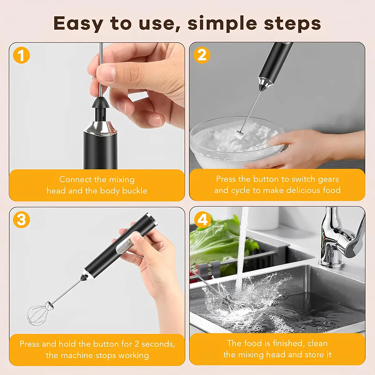 This rechargeable milk frother features a durable ABS handle and two food-grade 304 stainless steel whisks. Powered by an upgraded motor, it delivers high-speed frothing for rich, creamy foam in seconds. To clean, simply rinse the whisk head under water.