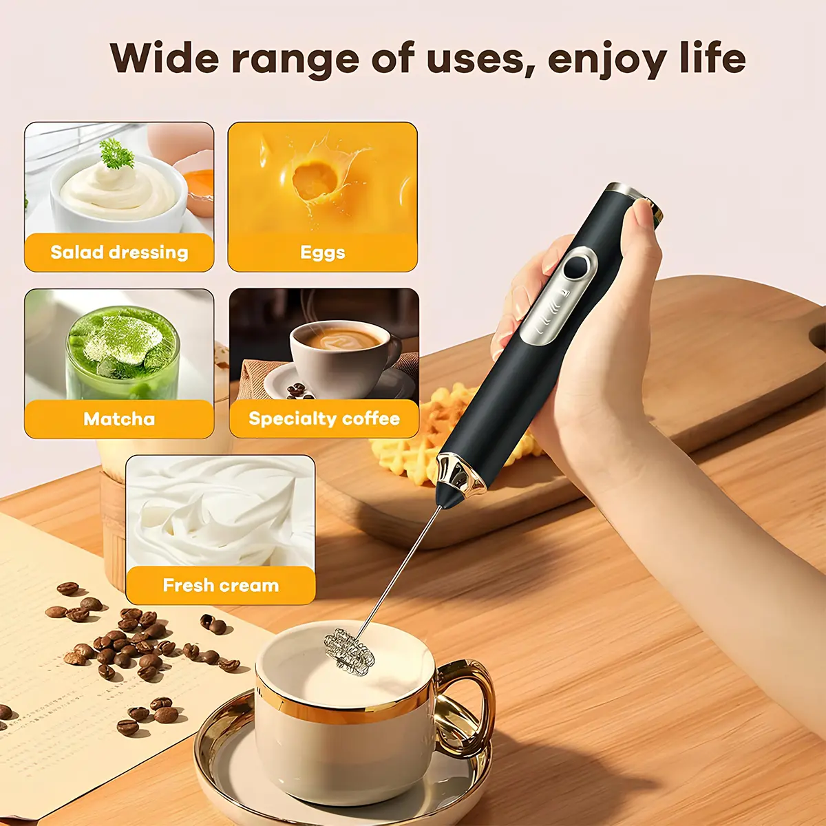 Choose from 3 speed settings—6000, 7000, or 8000 RPM—based on your mixing needs. Whether it's frothing milk or whisking eggs, just press and hold the ON/OFF button for 2–3 seconds to power off. Higher speeds produce finer foam in less time.
