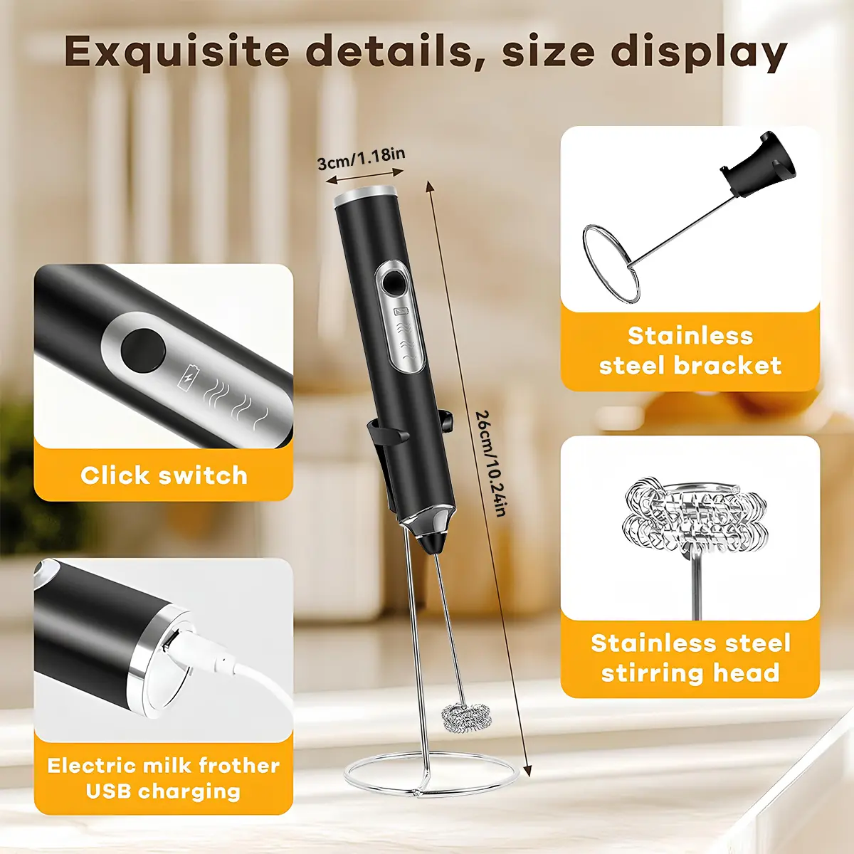 Equipped with a built-in 1200mAh rechargeable battery and a USB-C charging cable. The LED light turns red while charging and green when fully charged. Comes with a sleek stand that fits perfectly with your coffee bar setup.