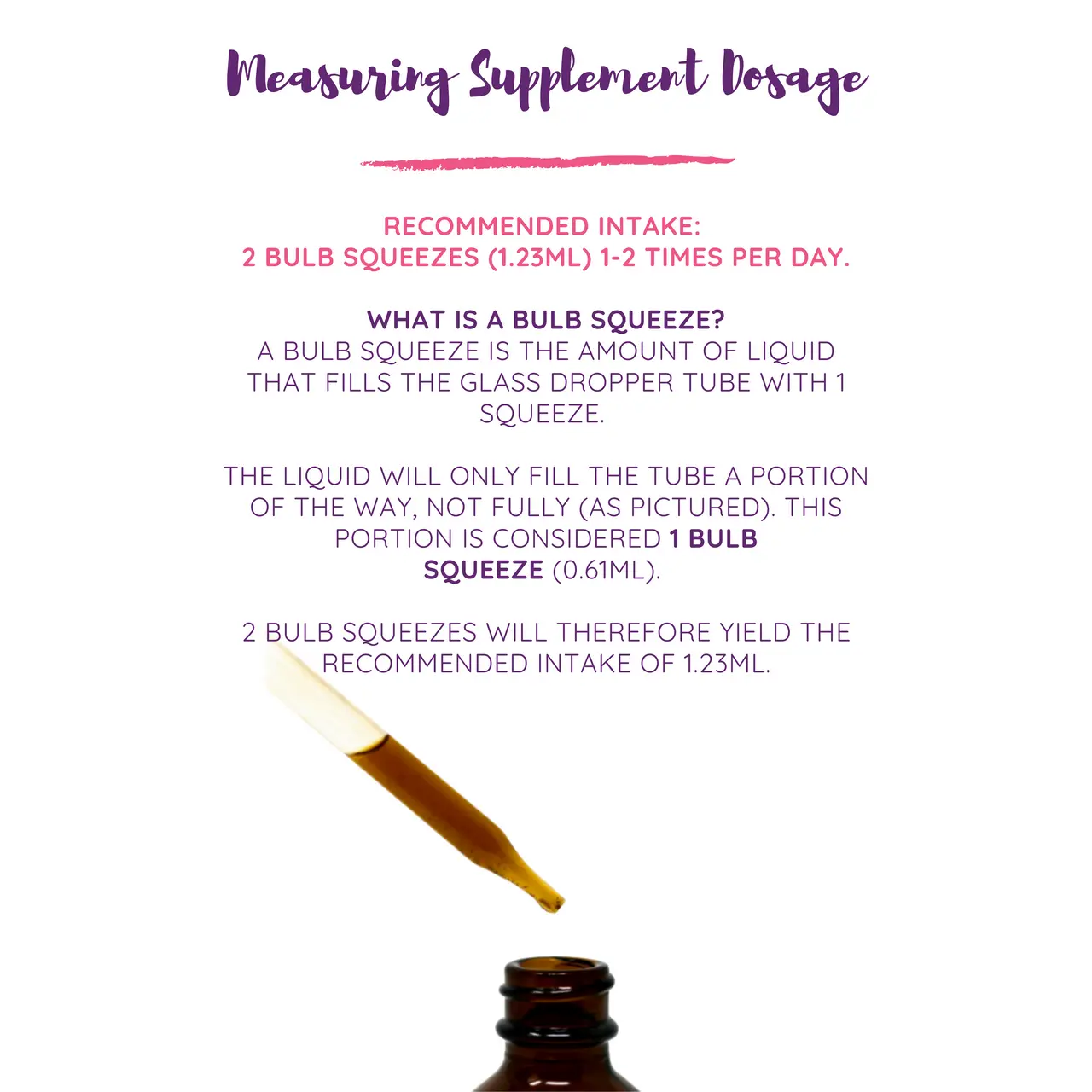 ·Bulb Squeeze: A bulb squeeze is the amount of liquid that fills the glass dropper tube with 1 squeeze. The liquid will only fill the tube a portion of the way, not fully. This portion is considered 1 bulb squeeze (0.61mL). 2 bulb squeezes will therefore yield the recommended intake of 1.23mL.
